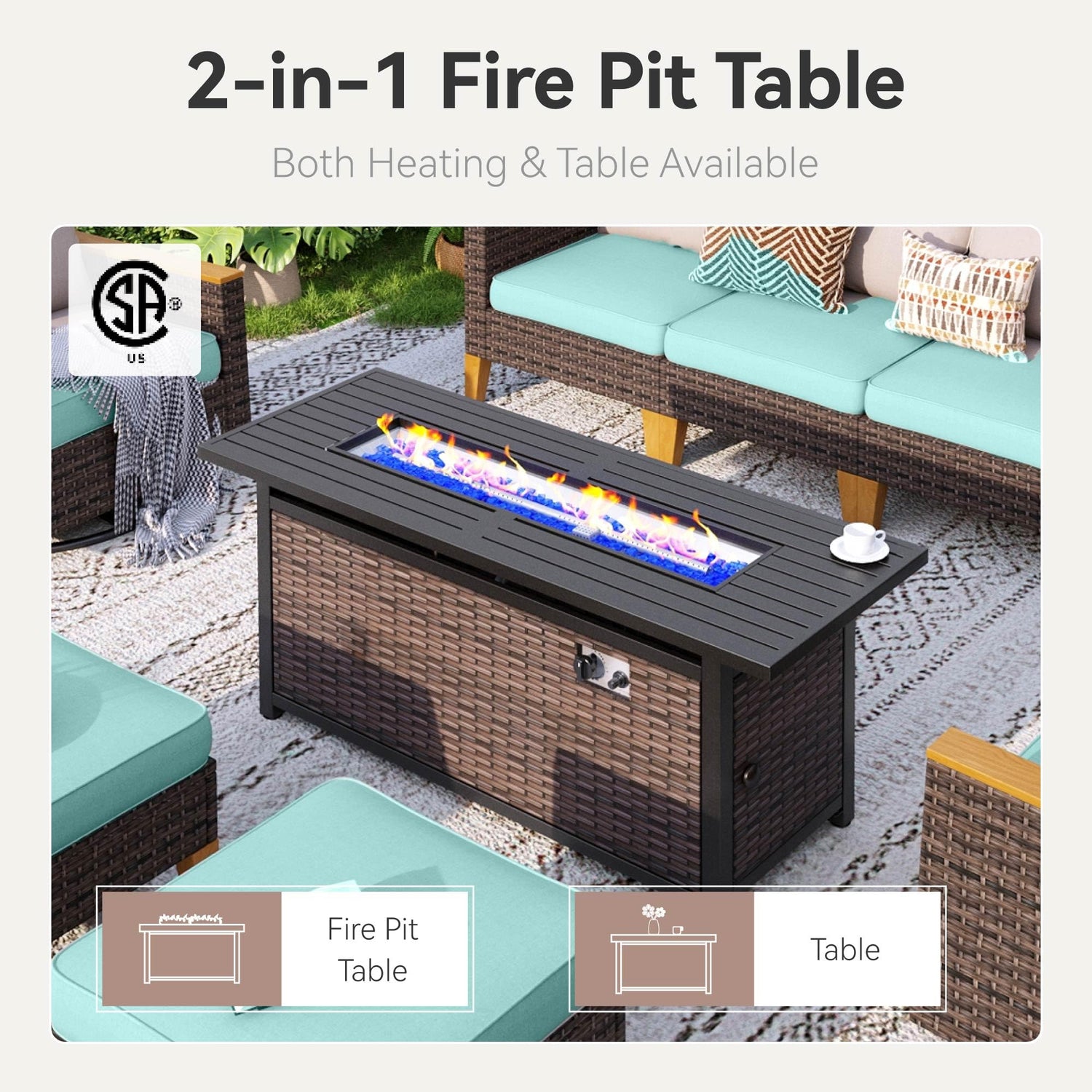 - 【Extra Lage 56-INCH 50,000BTU FRE PIT TABLE】Elevate your outdoor gatherings with our elegant wicker fire pit table, creating a warm and romantic bonfire atmosphere. This generously sized rectangular table boasts a removable lid and a robust 50,000 BTU stainless steel burner. It meets the stringent CSA certification requirements and proudly bears the CSA certificate.