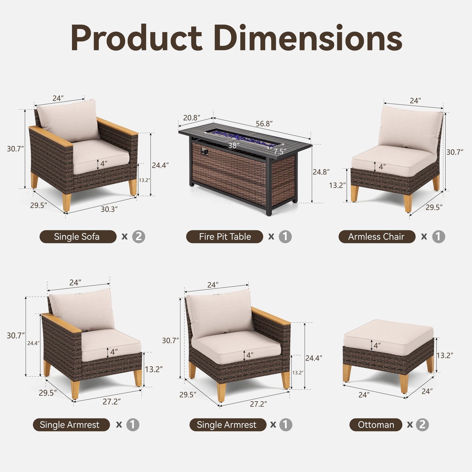 GREEN PARTY 7 Pieces Wicker Patio Furniture Set with 56" Fire Pit Table, All-Weather Outdoor Rattan Patio Sectional Sofa Conversation Set 7 Seats with 4" Thick Cushions for Garden, Backyard