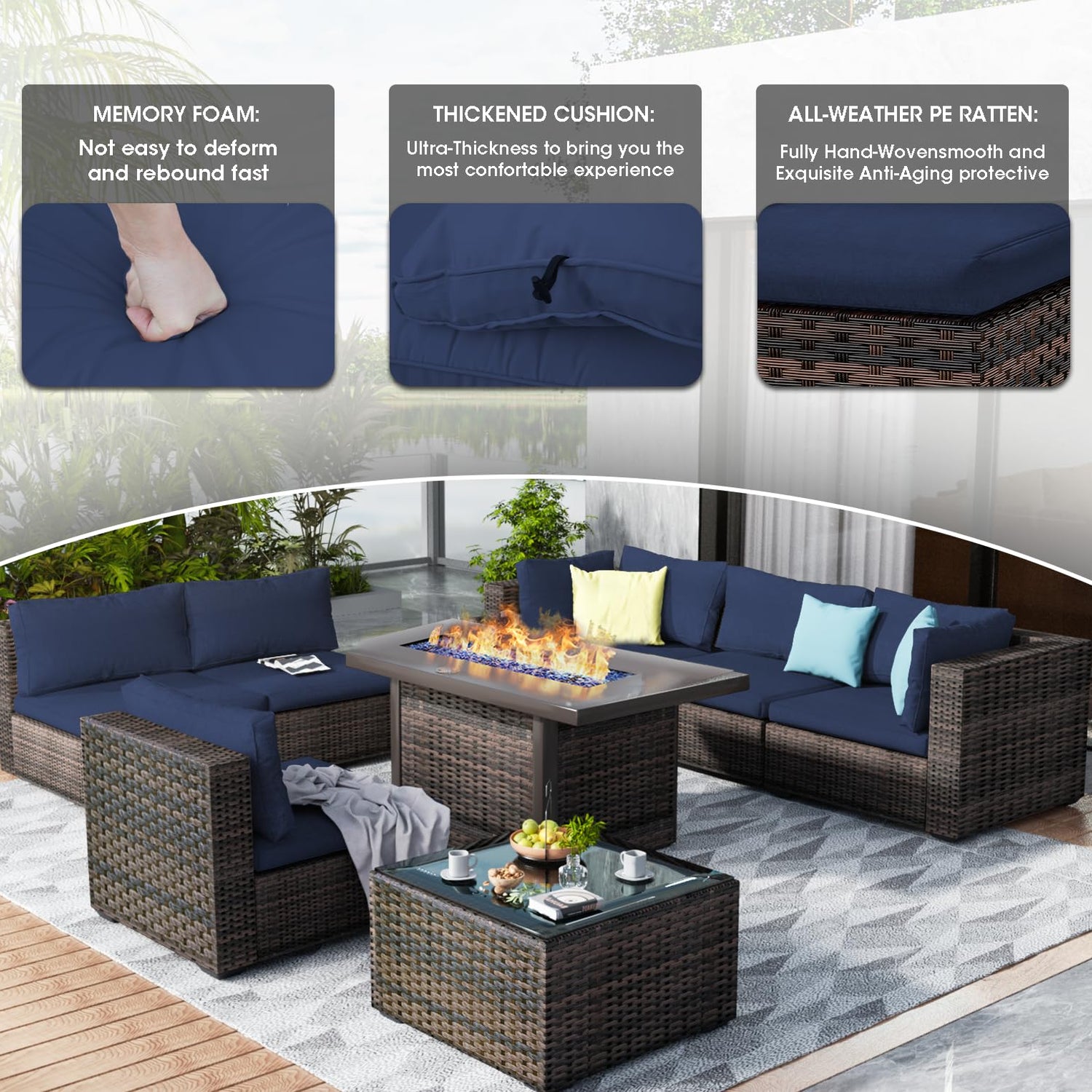 GREZJXC 7 Pieces Outdoor Sectional Patio Furniture Set with Fire Pit Table PE Rattan Wicker Patio Sectional Conversation Set with Cushion Navy Blue