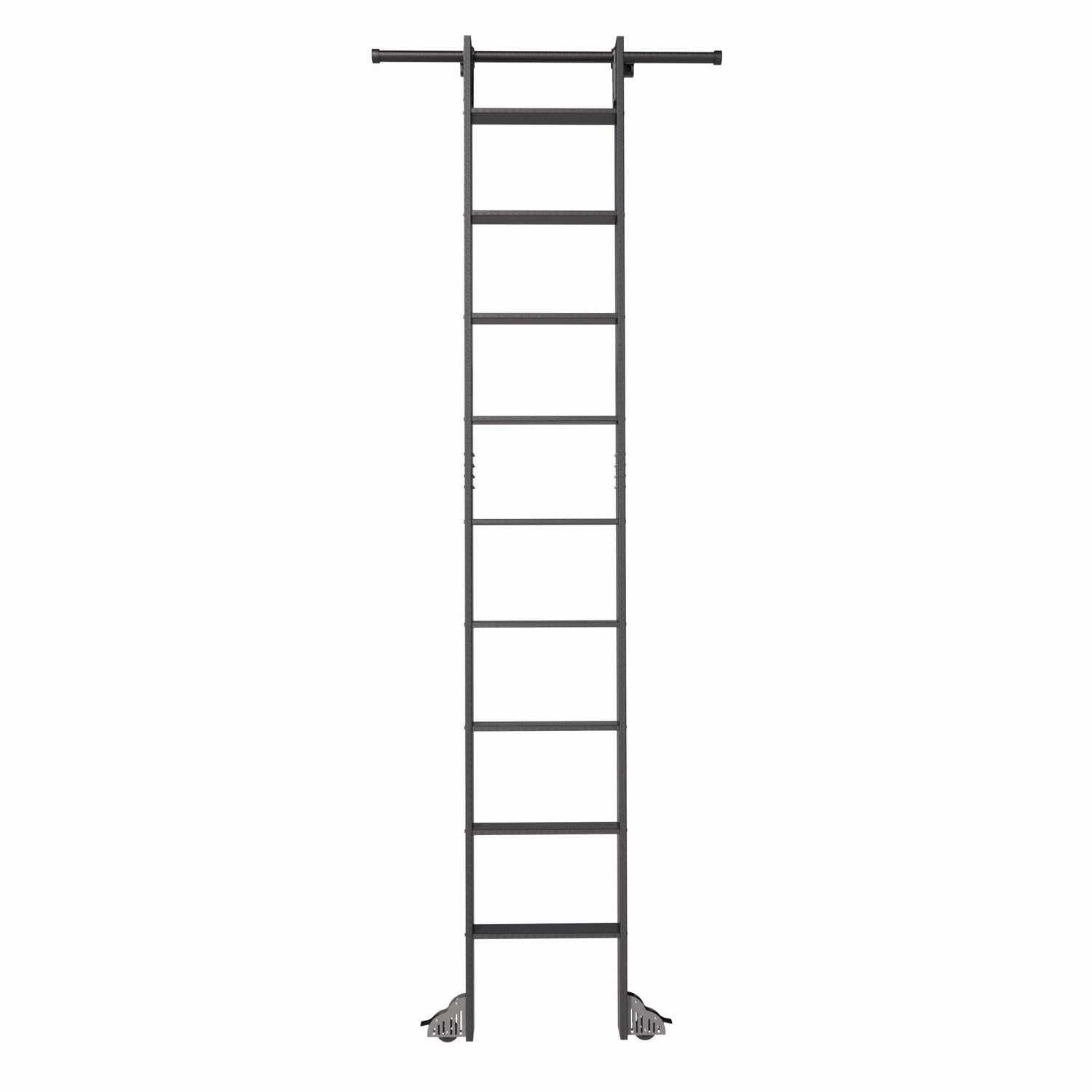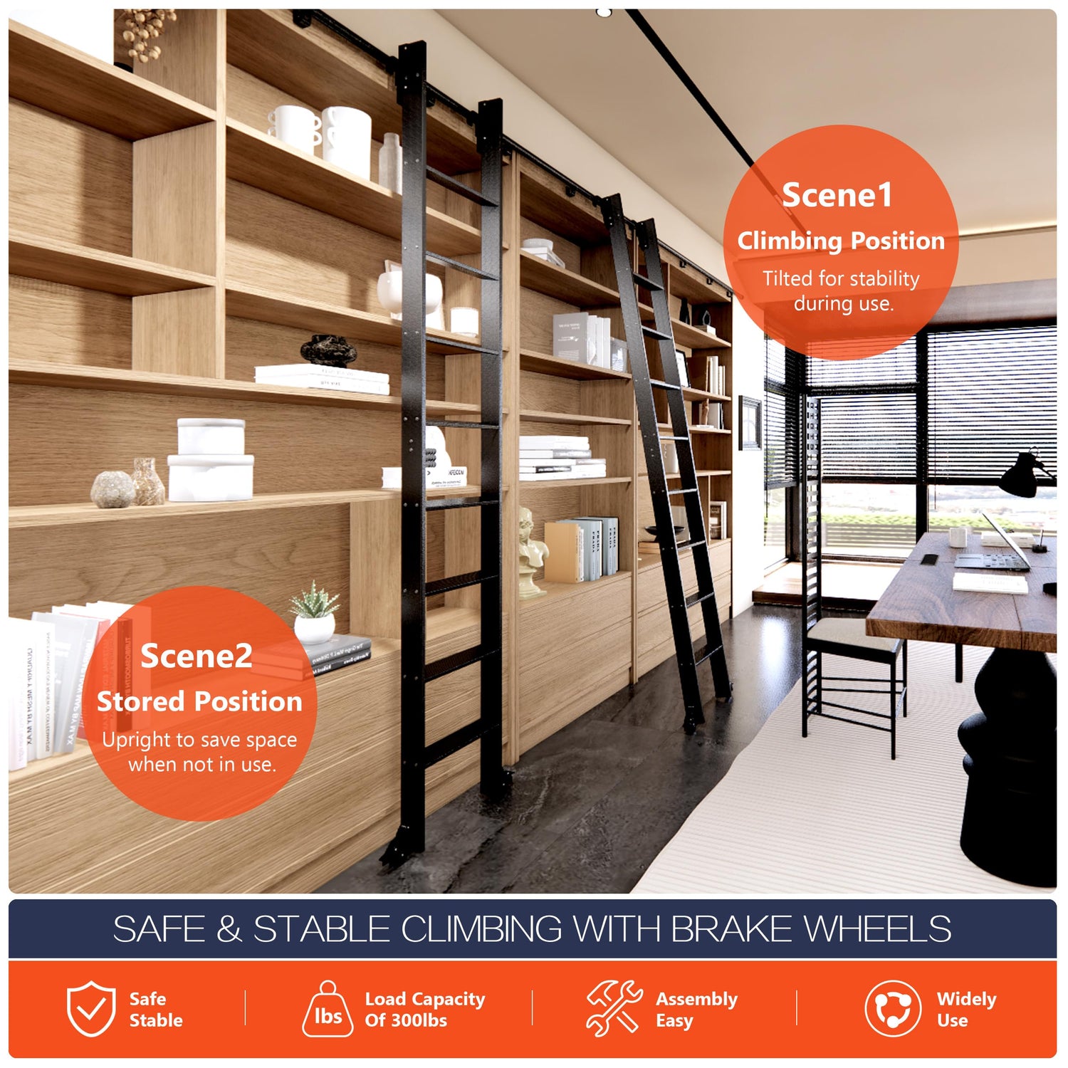 - Durable Aluminum Construction with Black Coating – Made from high-strength aluminum alloy, this sliding library ladder is lightweight yet durable. The black powder-coated finish enhances wear resistance and complements modern interiors, making it ideal for home offices, lofts, and libraries.