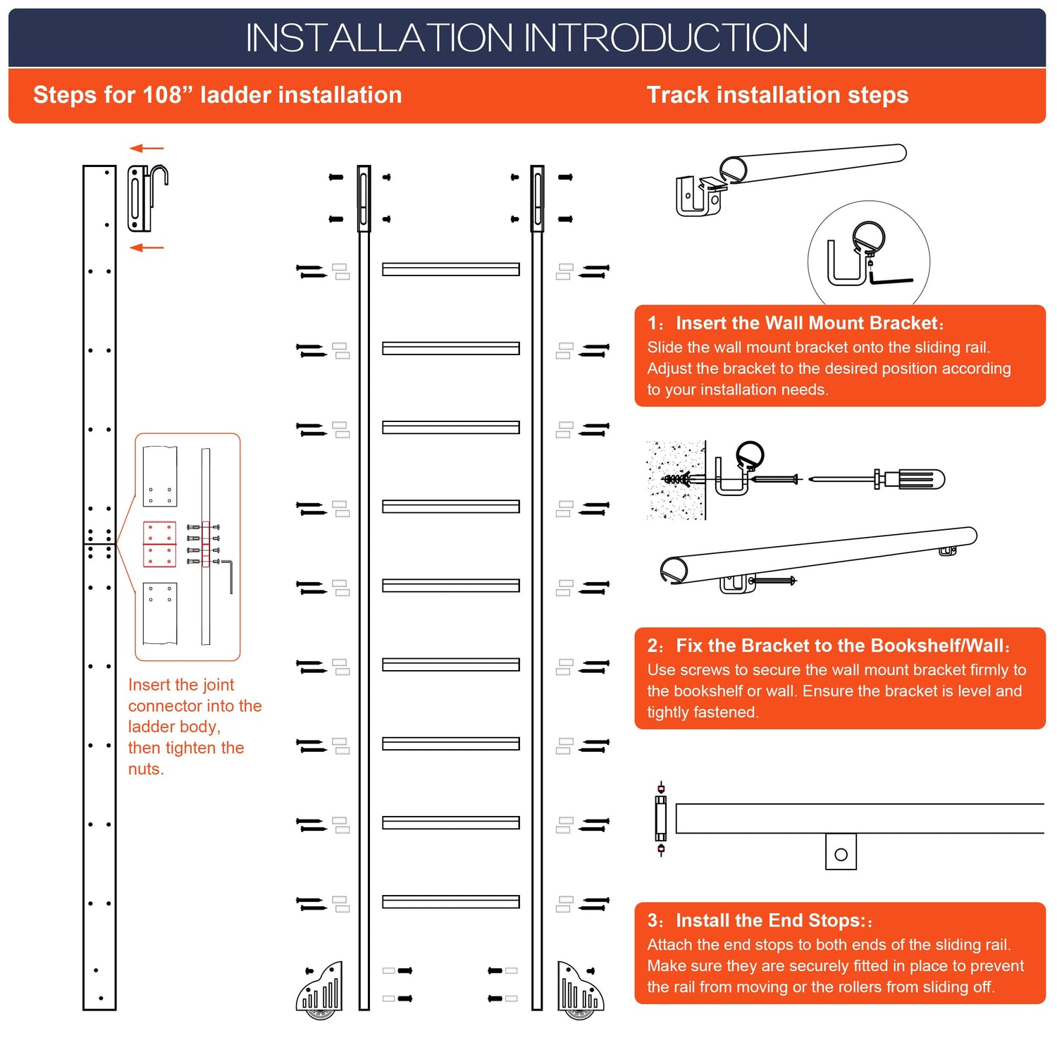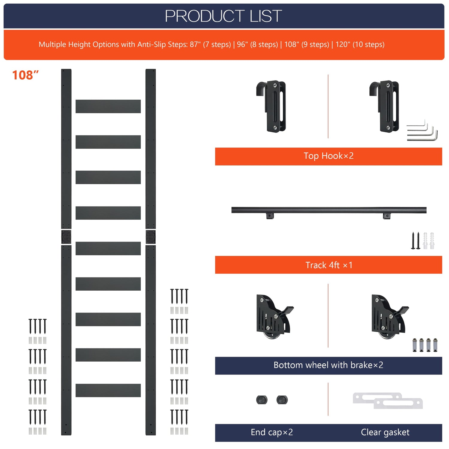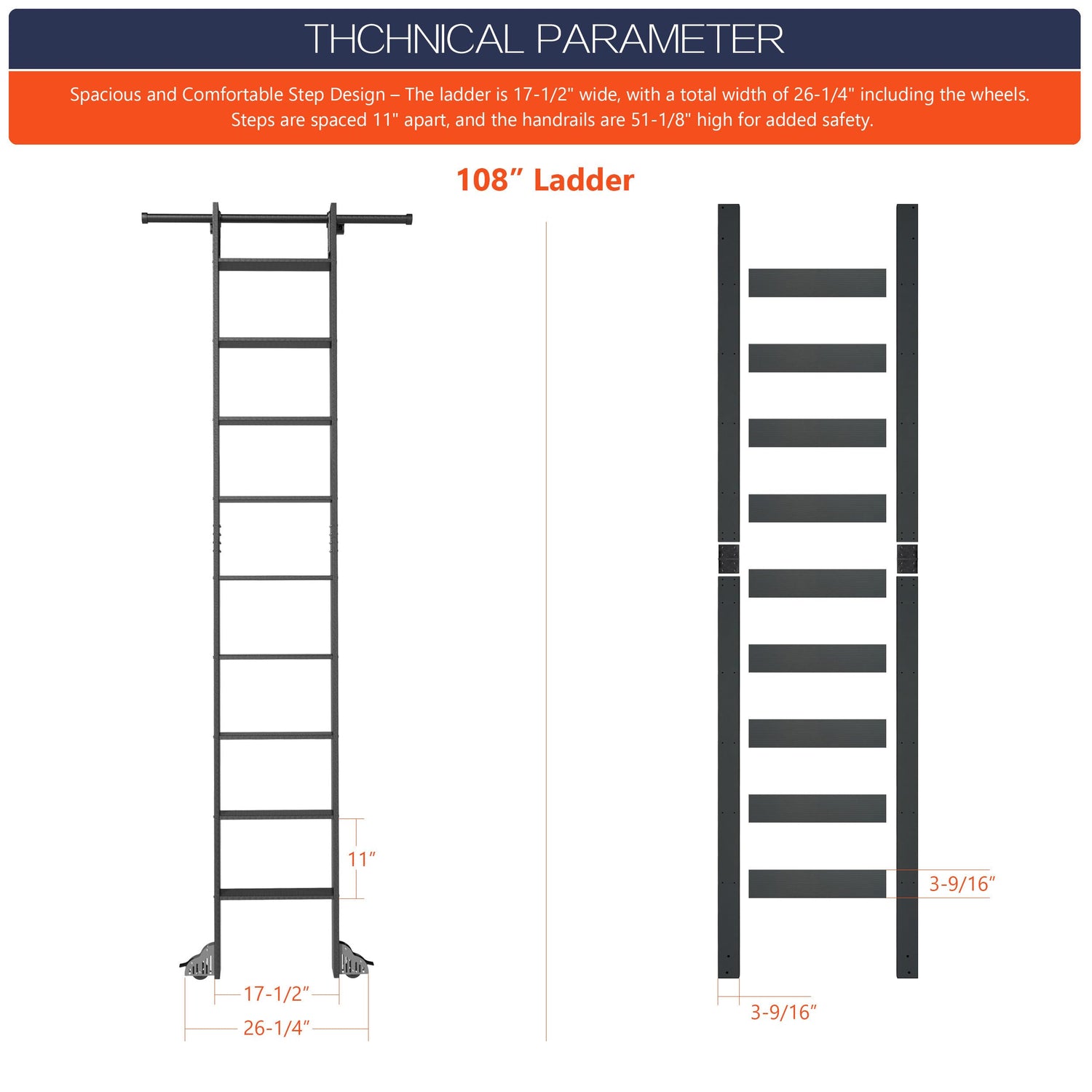 - Easy Assembly & Extendable Sliding Rail – The ladder requires assembly, with steps secured to the ladder frame using screws. The 108” and 120” models consist of two shorter boards connected with a joint connector. The included 4ft sliding rail allows for smooth movement, and if a longer rail is needed, extension rails can be added (B0BYZ2LPDM).