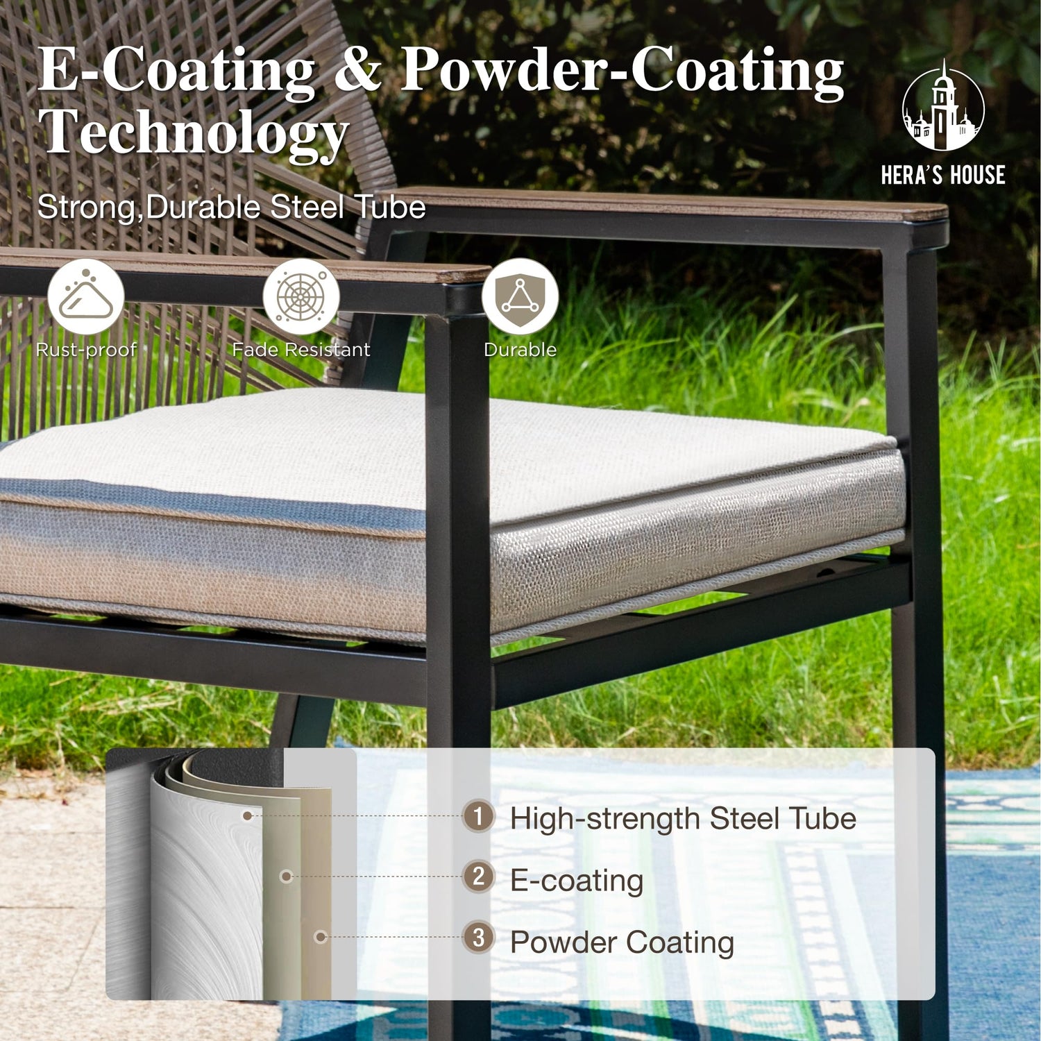- 【ALL WEATHER USE】Special CUSHION PRO technology applied on the fabric of this table and chairs set. It makes the dirt be easily wiped down. Water-proof, oil-proof and can be easily removed with the L-shaped zipper design