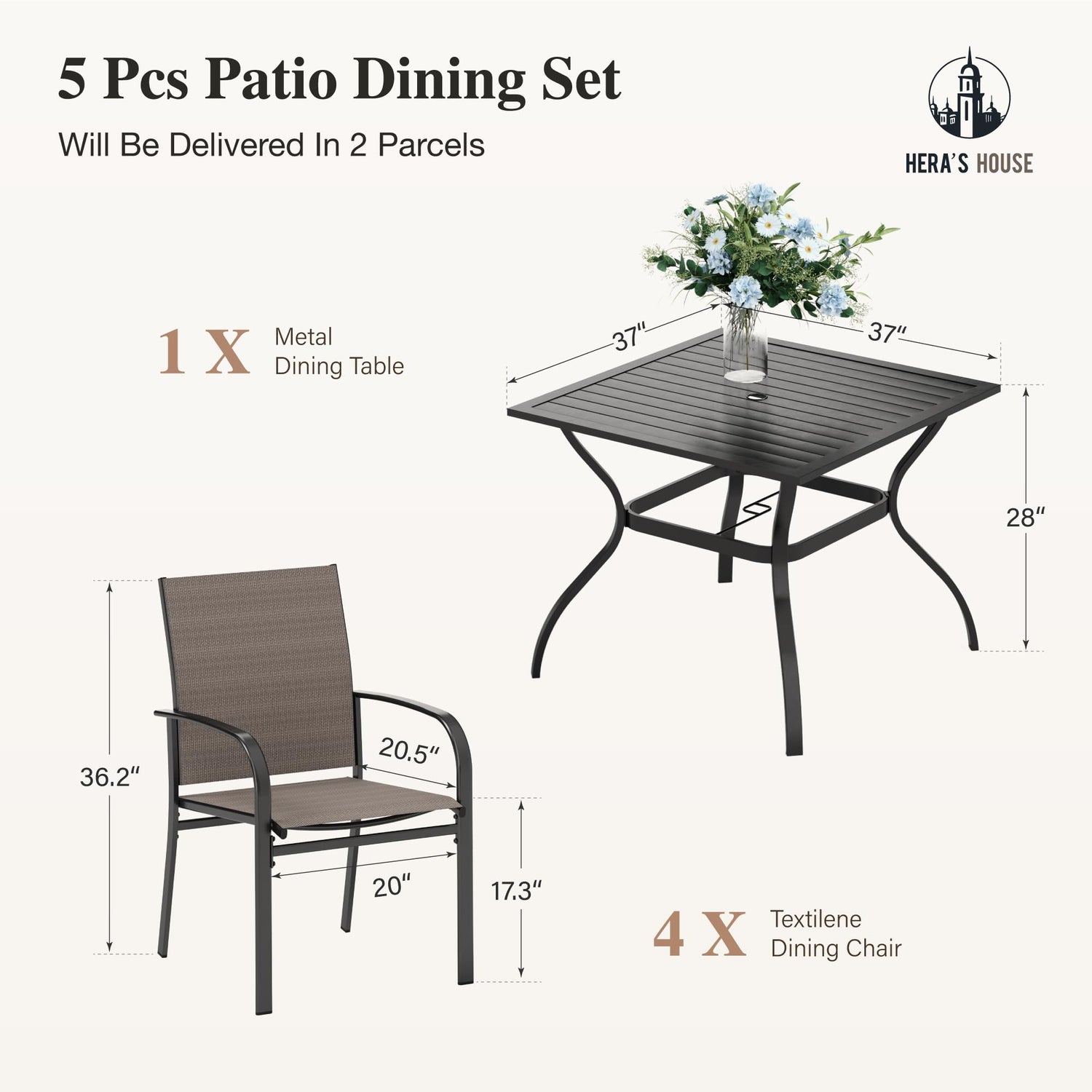 HERA'S HOUSE Patio Table and Chairs for 4, 5 Pieces Outdoor Deck Dining Sets, Square Metal Table Set with Chairs for Lawn Garden Backyard, Brown