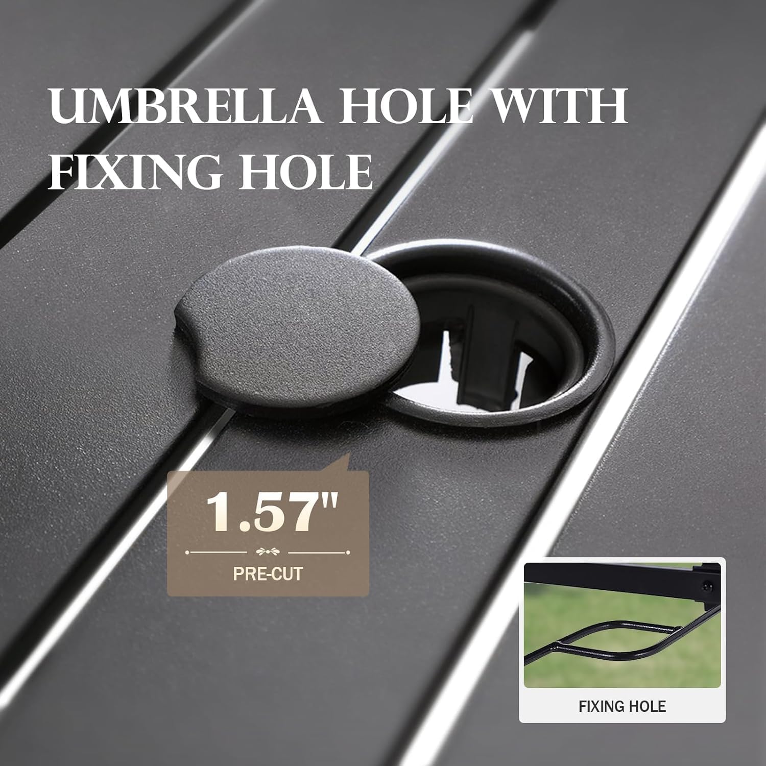 - 【Outdoor Table Sets with Umbrella Hole】Slatted metal table top leaves enough water seepage gaps, which is easy to clean and won’t accumulate water. φ1.57" umbrella hole is suitable for most umbrella in the market. The patio dining table with unique leveling feet that adapt to uneven ground, providing unparalleled strength and stability