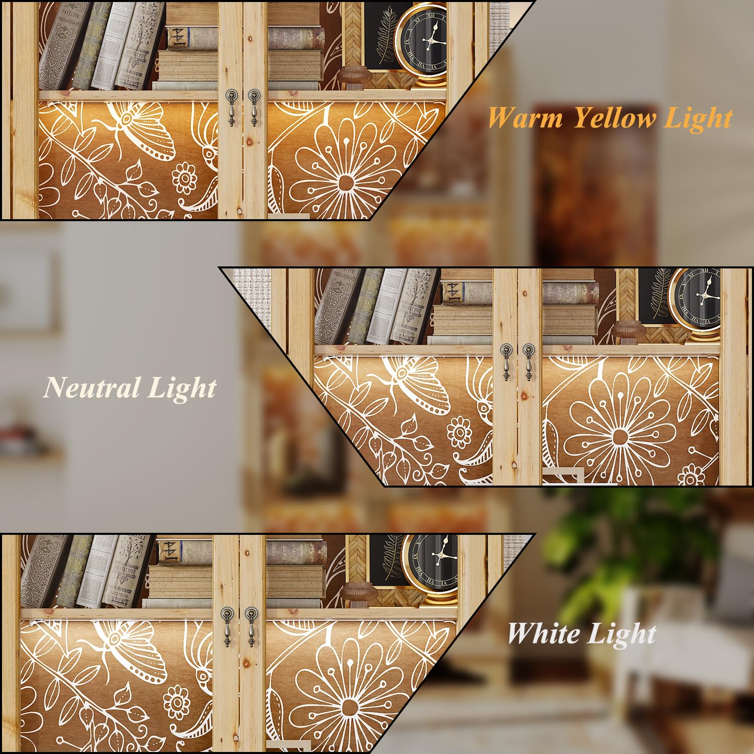 - Adjustable LED - This curio cabinet has LED strips offering three customizable lights, warm yellow for a cozy glow, neutral for clear lighting, and cool white for a modern bright feel. The adjustable settings allow you to set the ideal mood or visibility, energy-efficient and easy to use