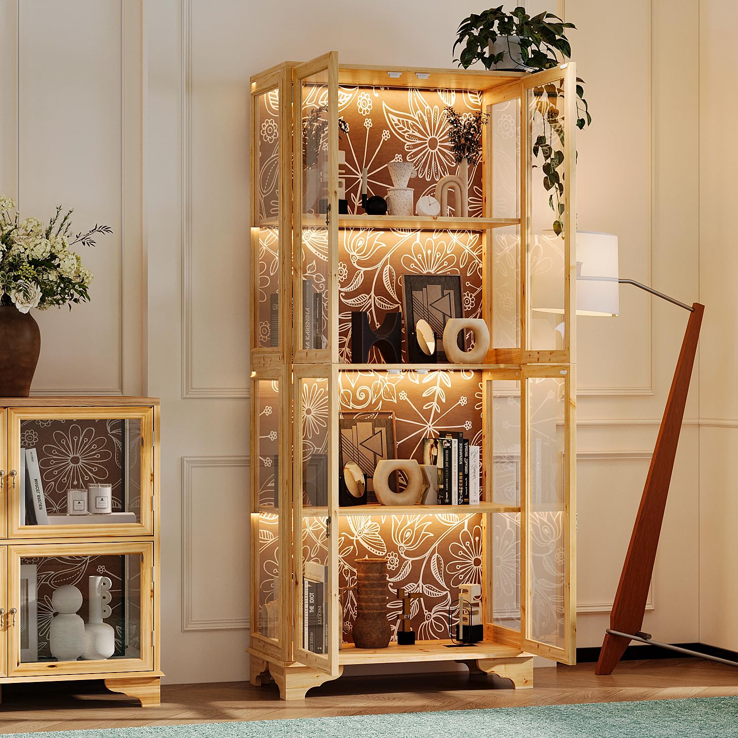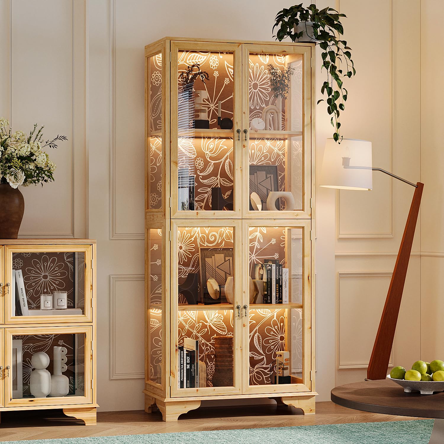Hitow Glass Curio Cabinet Display Case with LED Light & 4 Doors, 4-Tier Flower-Patterned Glass Showcase Display Cabinet, 74.2" H Bookshelves and Bookcases for Living Room, Wood Grain