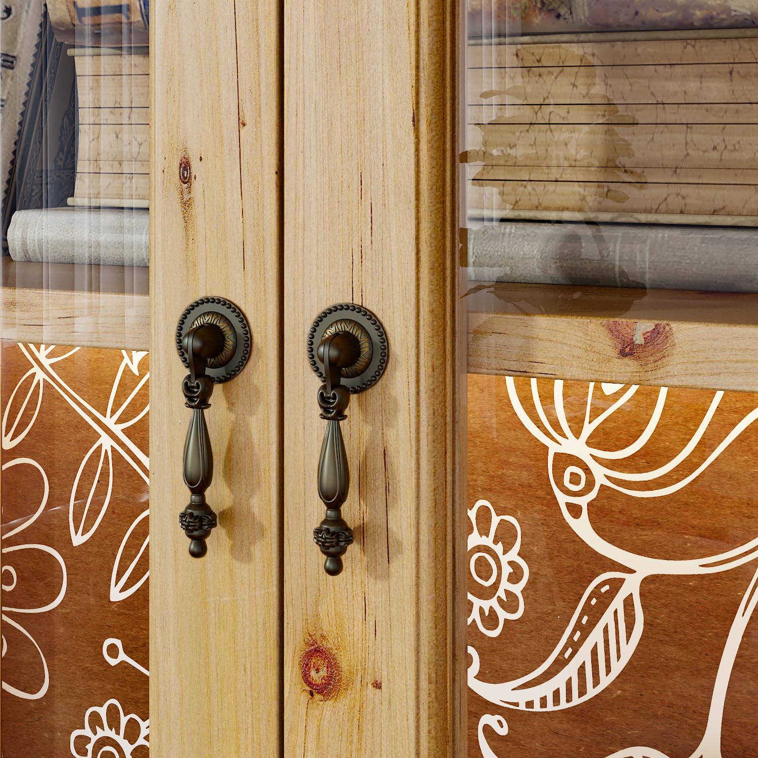 - Vintage-View Display Cabinet - This tall bookcase offers transparent views from three sides, featuring a beautifully decorated flower-patterned back panel. The frame showcases a wood grain finish, complemented by retro-style metal handles for a classic touch. Raised on four elevated feet, it provides both added visibility and a light, airy presence