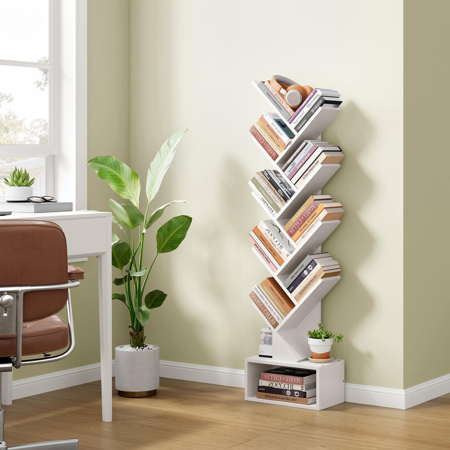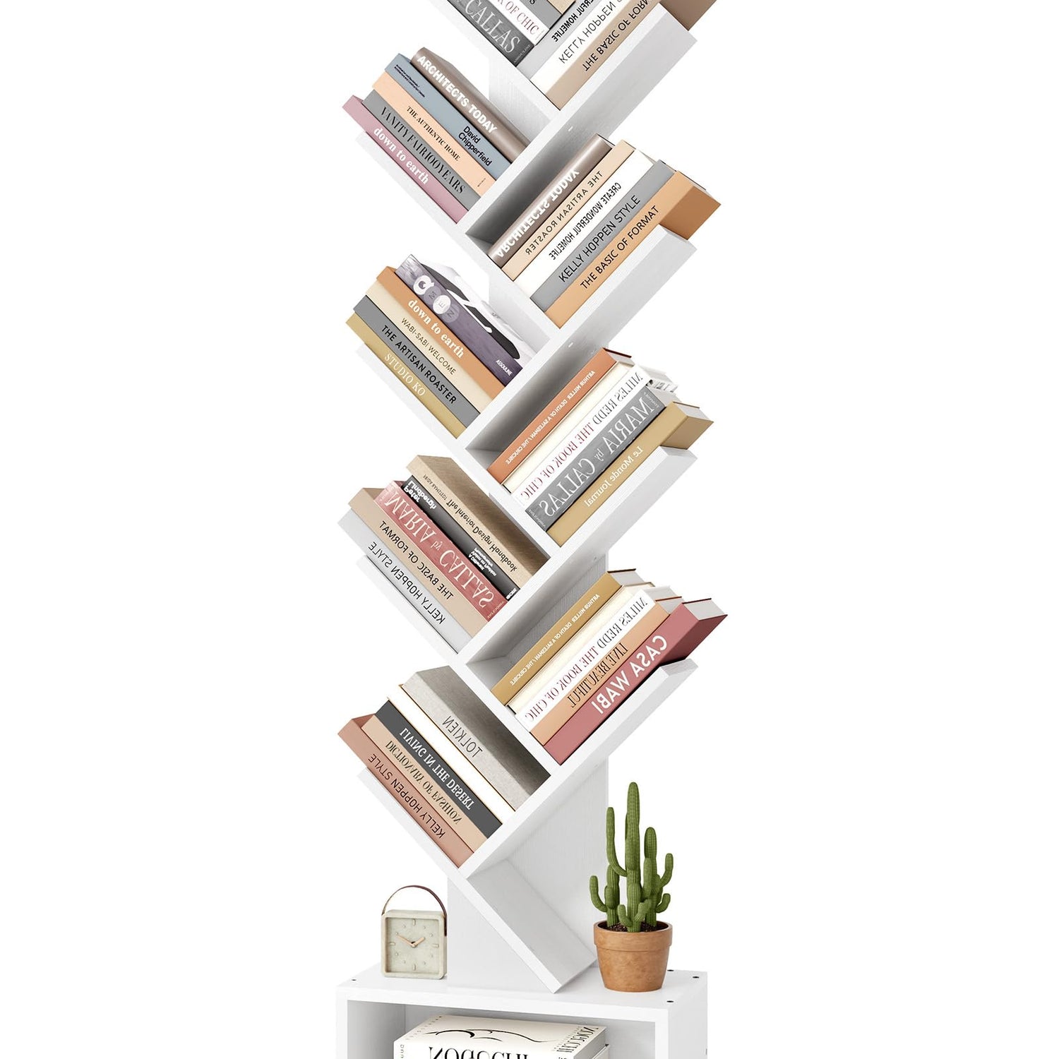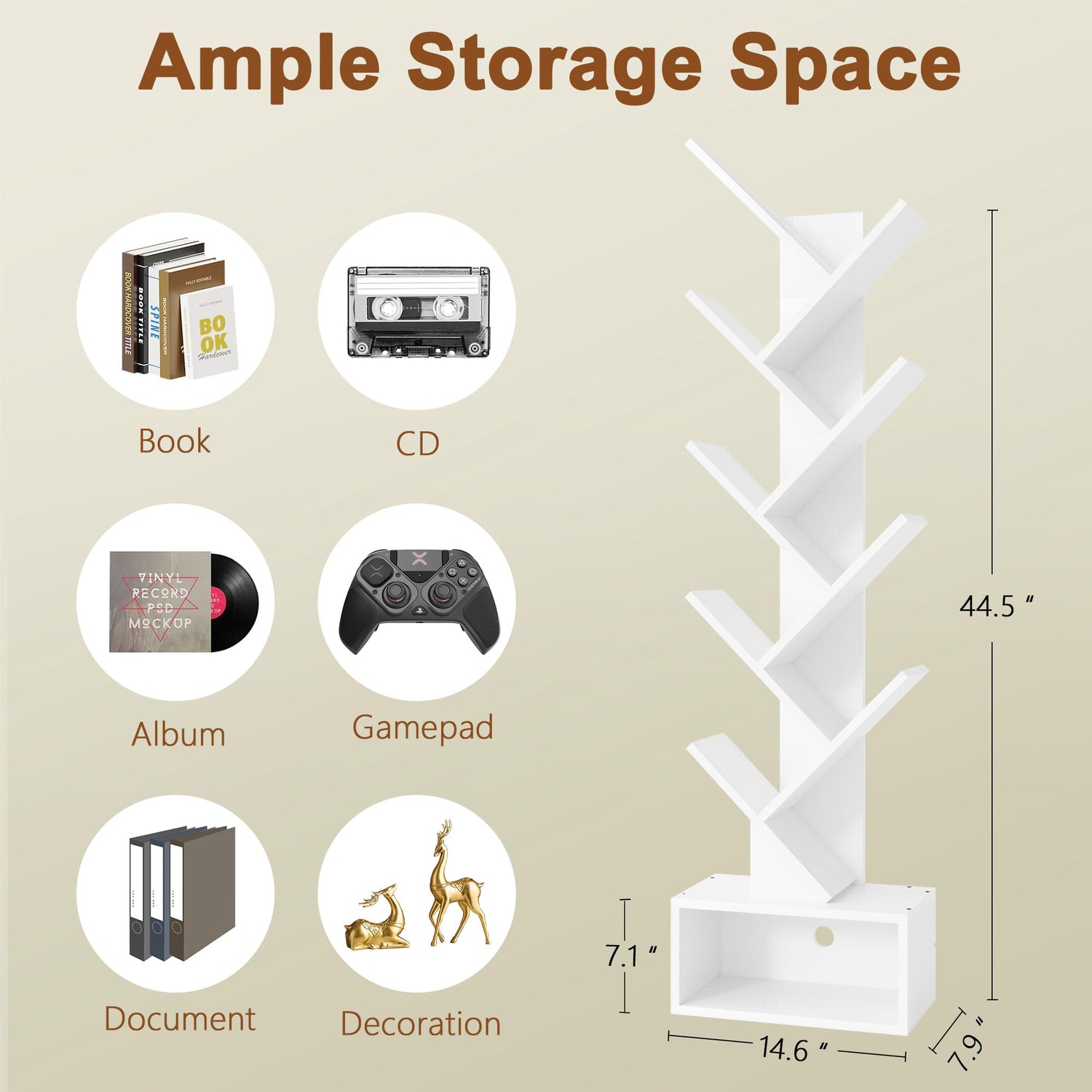 - Space Saving & Ample Storage Capacity: Hoctieon 9-tier tree bookshelf features nine open shelves and a spacious drawer for storage. It provides an ideal solution for organizing books, CDs, magazines, video games, manga, novels, potted plants, photo albums, crafts, and etc. Its slim design allows for easy relocation to any corner or compact area.
