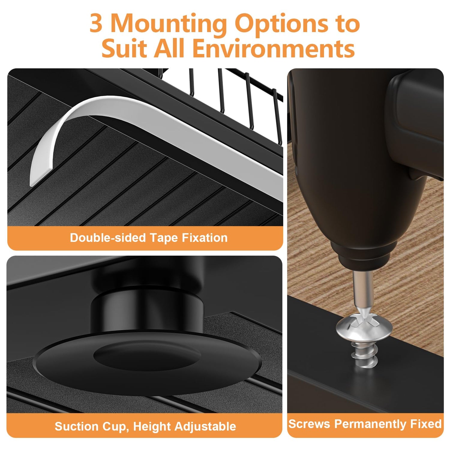 - 3 secure mounting options: under cabinet organizer Installation (1) Power suction cups for non-destructive installation (2) Waterproof adhesive tape for semi-permanent installation (3) Screws for permanent fixing on tiled/wooden surfaces