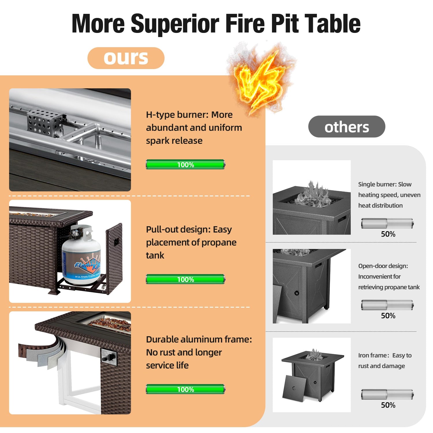 • CSA Certified Fire Pit Table - This CSA certified smokeless fire pit unit burns efficiently at 50,000 BTU, with an upgraded twin-tube burner for a more even burn. At the same time, our products use propane gas as fuel, which makes the whole combustion process cleaner and safer. You don't have to worry about ashes and smoke, just feel the romantic campfire atmosphere quietly.