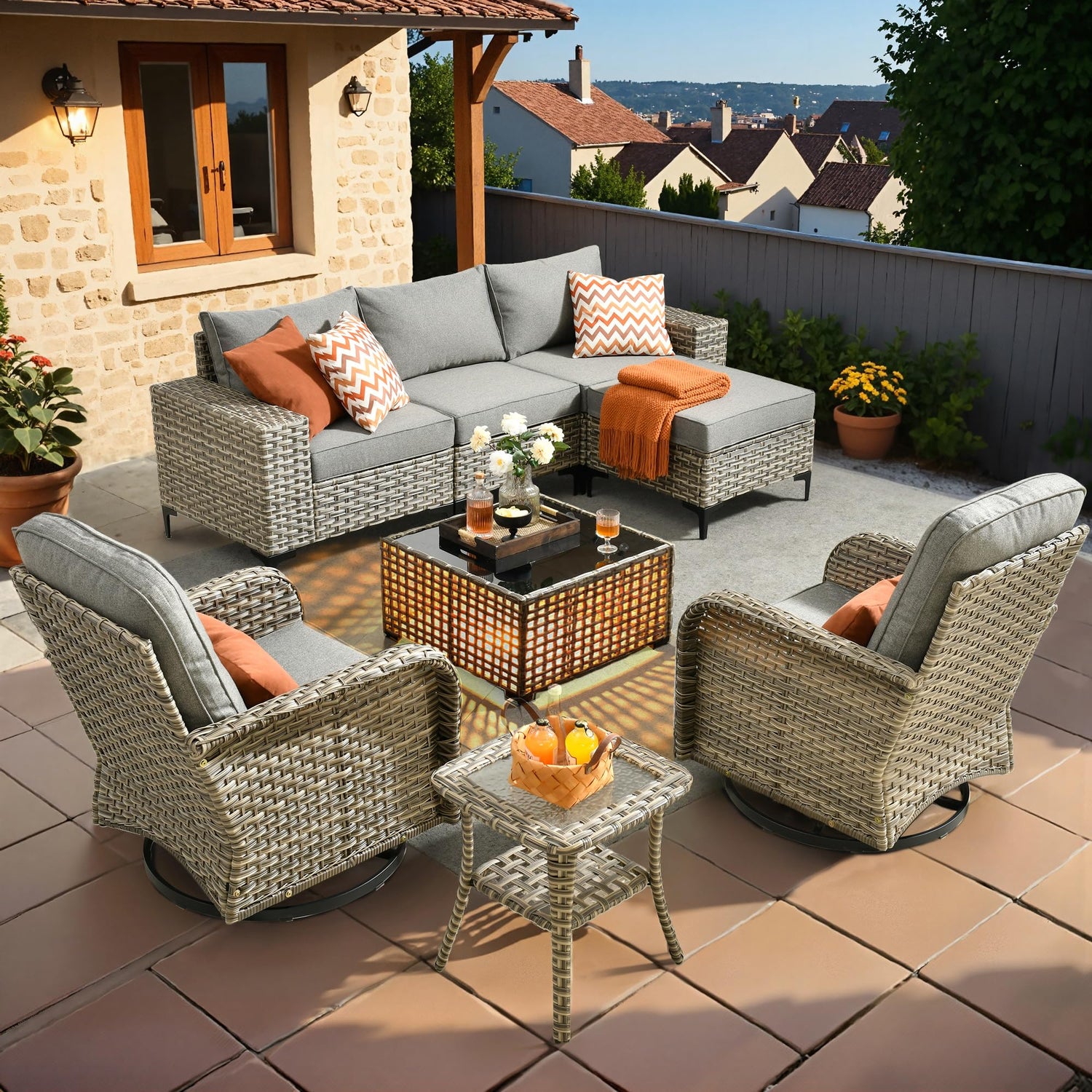 HOOOWOOO Outdoor Sectional Furniture Set,8 Pieces Wicker Patio Conversation Sets,L Shape All Weather Outside Couch Sofa Set with Swivel Chairs Solar Light Table Ottoman,Charcoal Gray