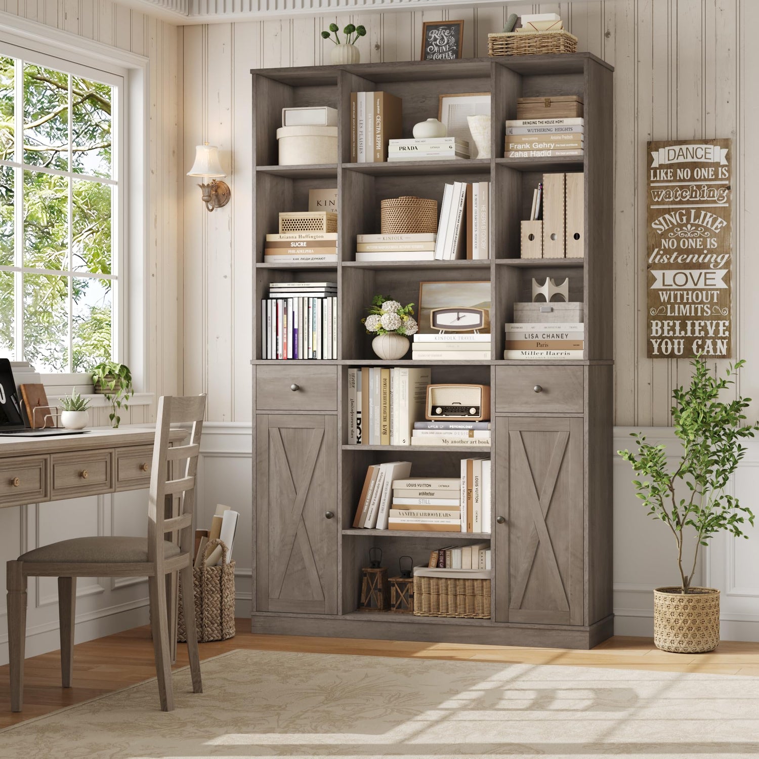 HOSTACK 74" Tall Book Shelf and Bookcase, 45" Wide Bookcase with Doors and Drawers, Modern 6 Tier Bookshelf with Storage, Large Wood Display Cabinet with Adjustable Shelves for Home Office, Ash Grey