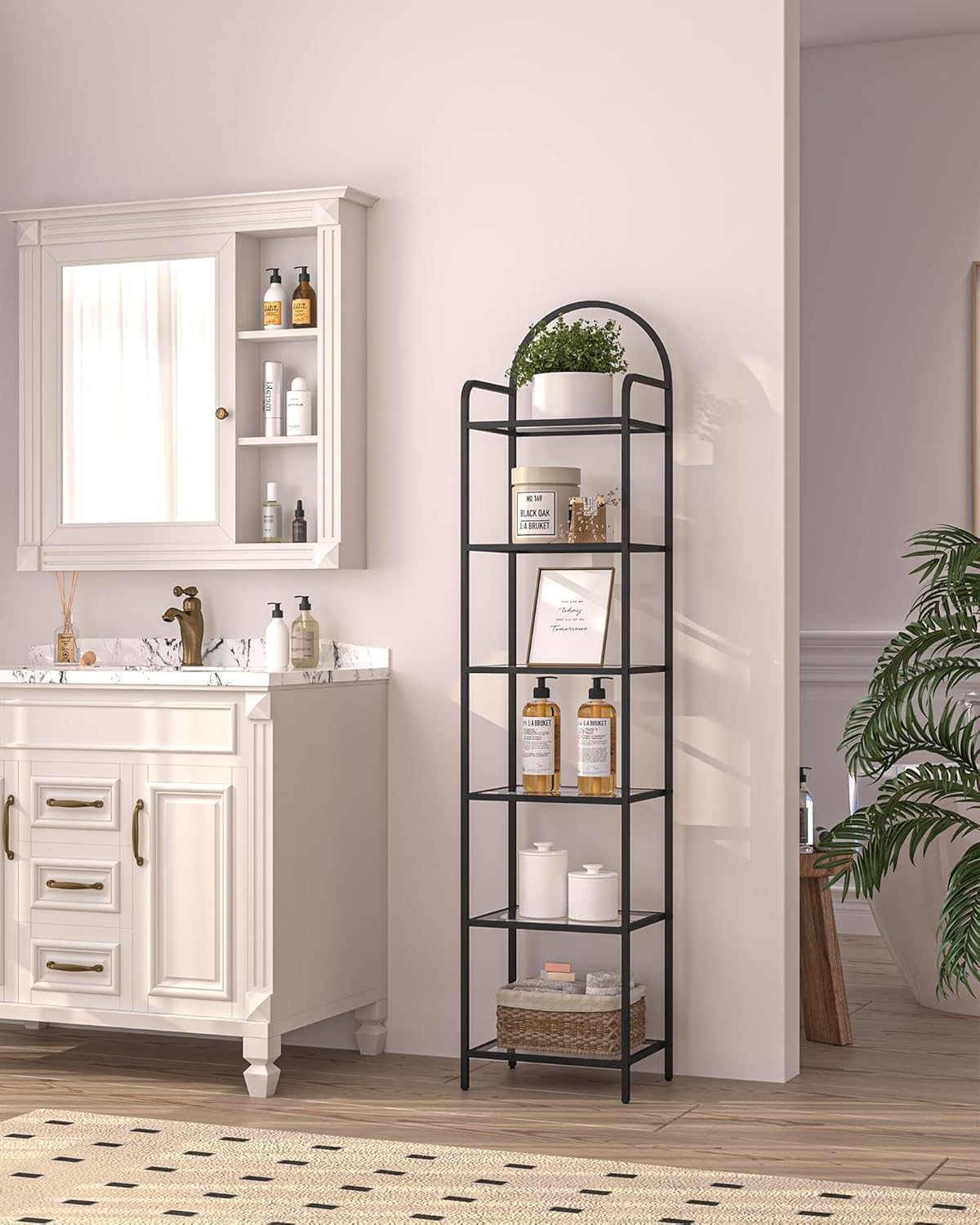 - Decorate Your Room: With transparent tempered glass shelves and a black frame, this 6-tier storage rack allows you to display your greenery, books, and collectibles while elevating the look of your space. The top oval design makes this bookcase unique and stylish,and helps to decorate your room
