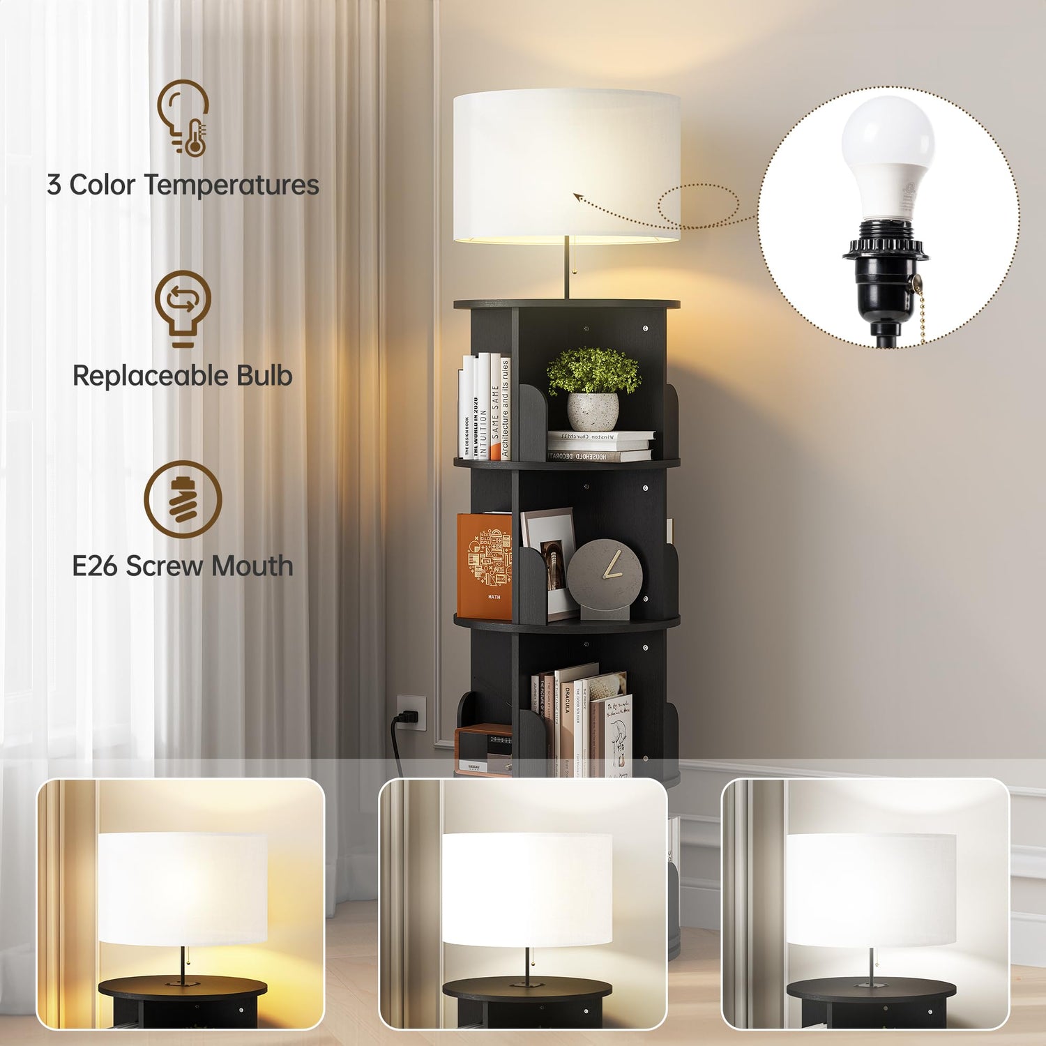 iabifo Rotating 4-Tier Bookshelf with Adjustable Light, 360° Spinning Bookcase Tower, Tall Floor Standing Book Shelf for Bedroom, Living Room, Office, Black