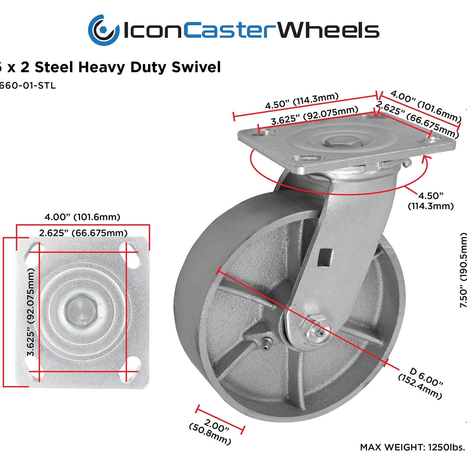 ICONCASTERWHEEL 6" x 2" Steel Heavy Duty Casters, Set of 4 Industrial Casters | 4 Swivel Top Plate Caster, Top Plate 4 x 4.5, Load Capacity 4,800 lbs per Set (4-Pack)