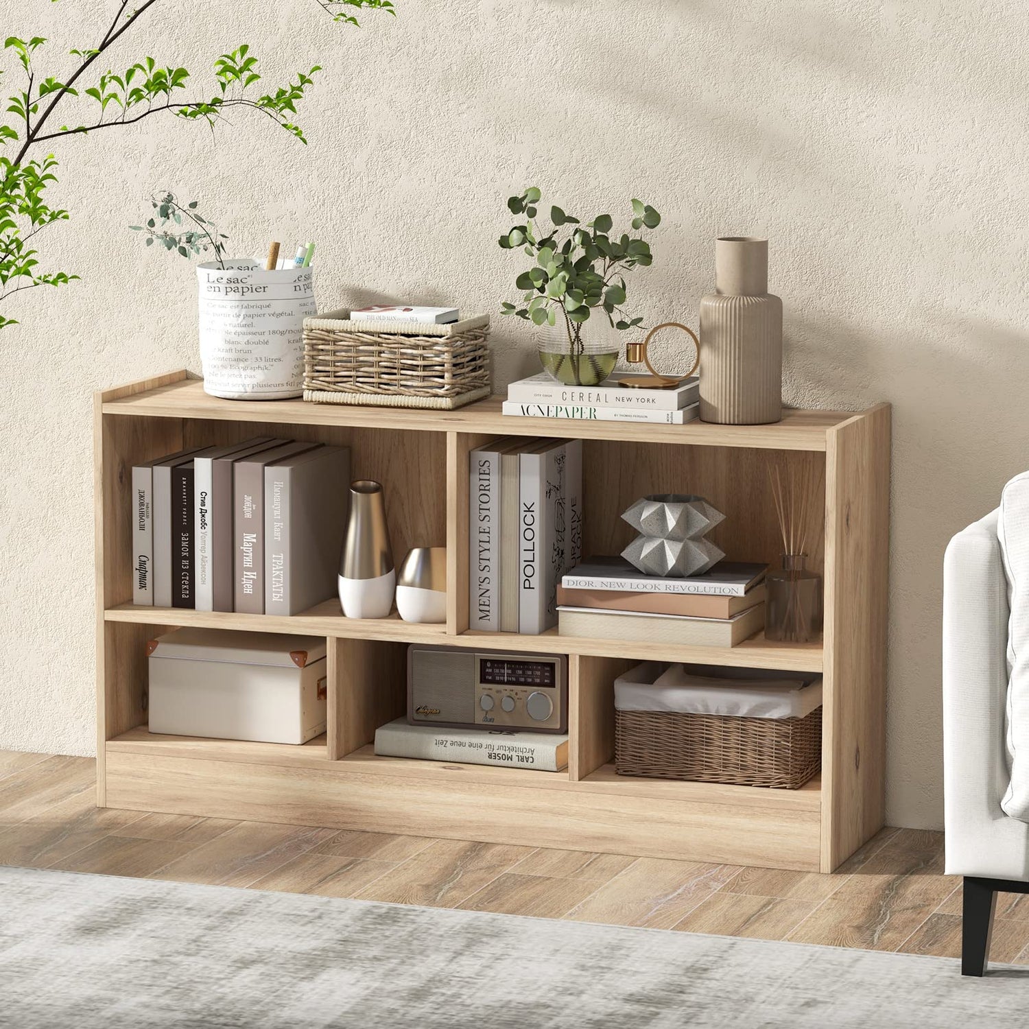 IFANNY 5 Cube Bookcase, 2 Tier Bookshelf Organizer w/Open Compartments, Horizontal Wood Bookshelves & Bookcases with Storage, Modern Book Shelf for Bedroom, Living Room, Play Room (Natural)