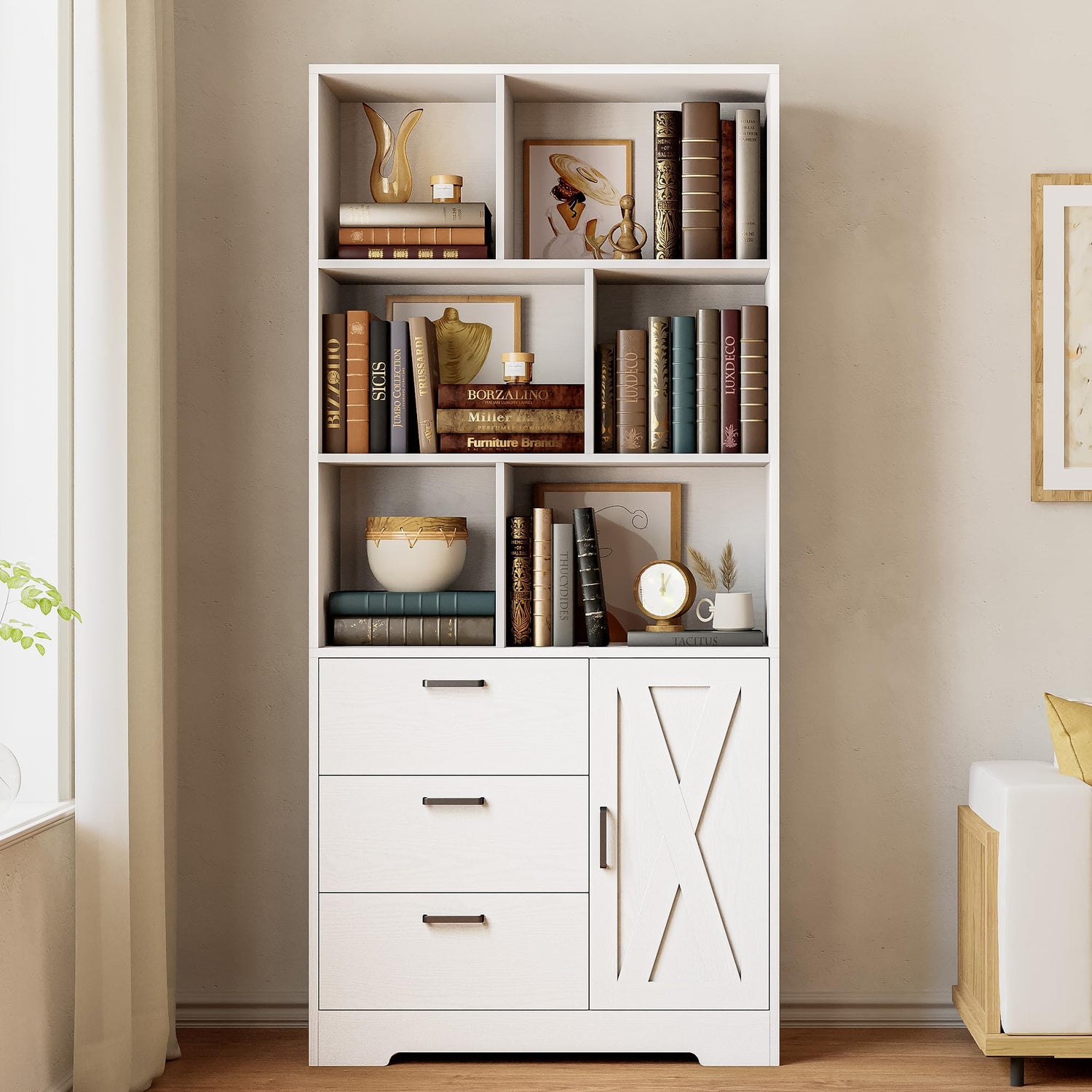 IRONCK Bookshelf with Drawers, 70.9 inch Tall Bookcase with Doors, Bookshelves and Bookcases with Storage, Bookshelf with 6 Open Cubes for Home Office, Living Room, Study, White