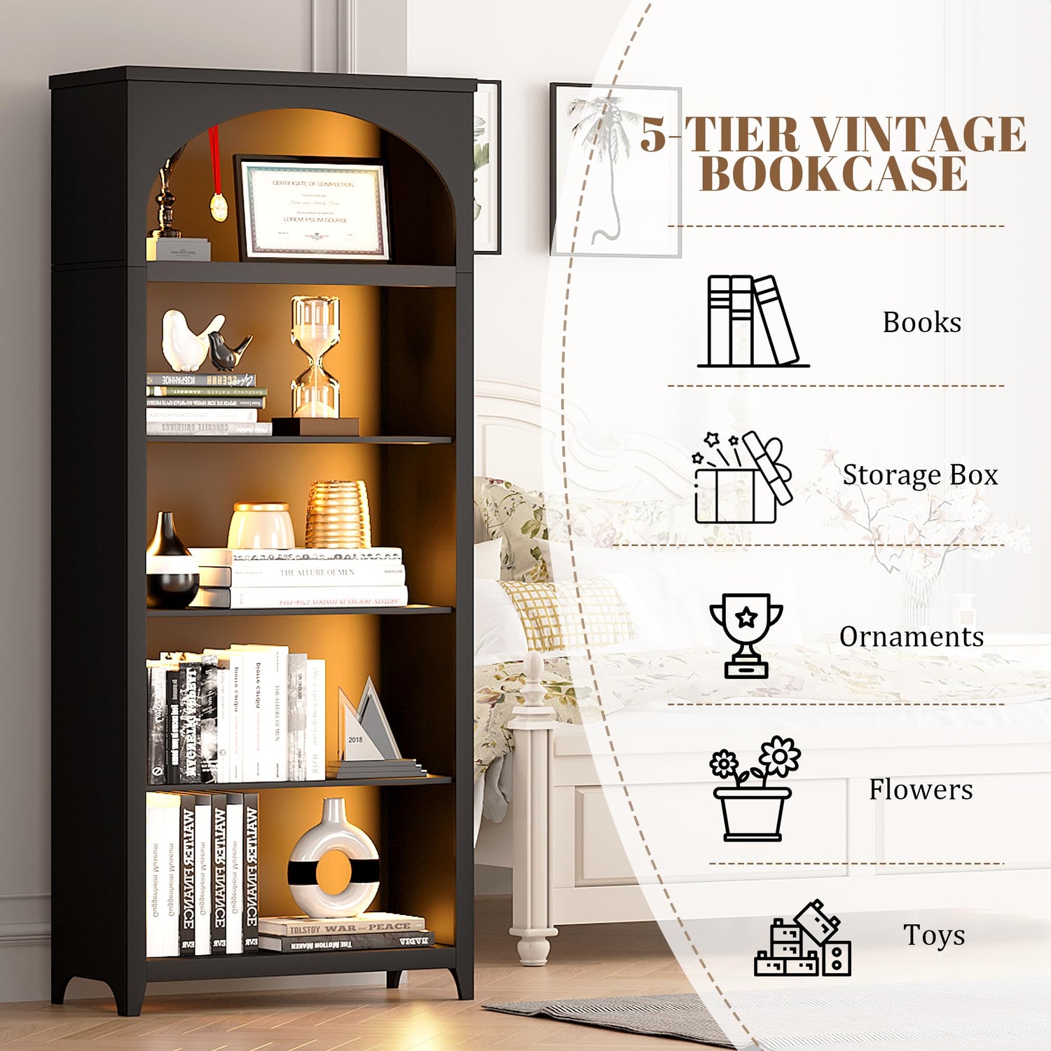 - 【Elevate Your Home Décor with Style & Storage】This 5-tier arched bookshelf blends modern farmhouse elegance with practical organization. Perfectly suited as a display shelf for your collections, books, and décor, it enhances any living room, bedroom, home office, kids room, or dorm. Its versatile design also serves as a compact storage organizer for cubes, toys, and clutter, keeping your space tidy and stylish