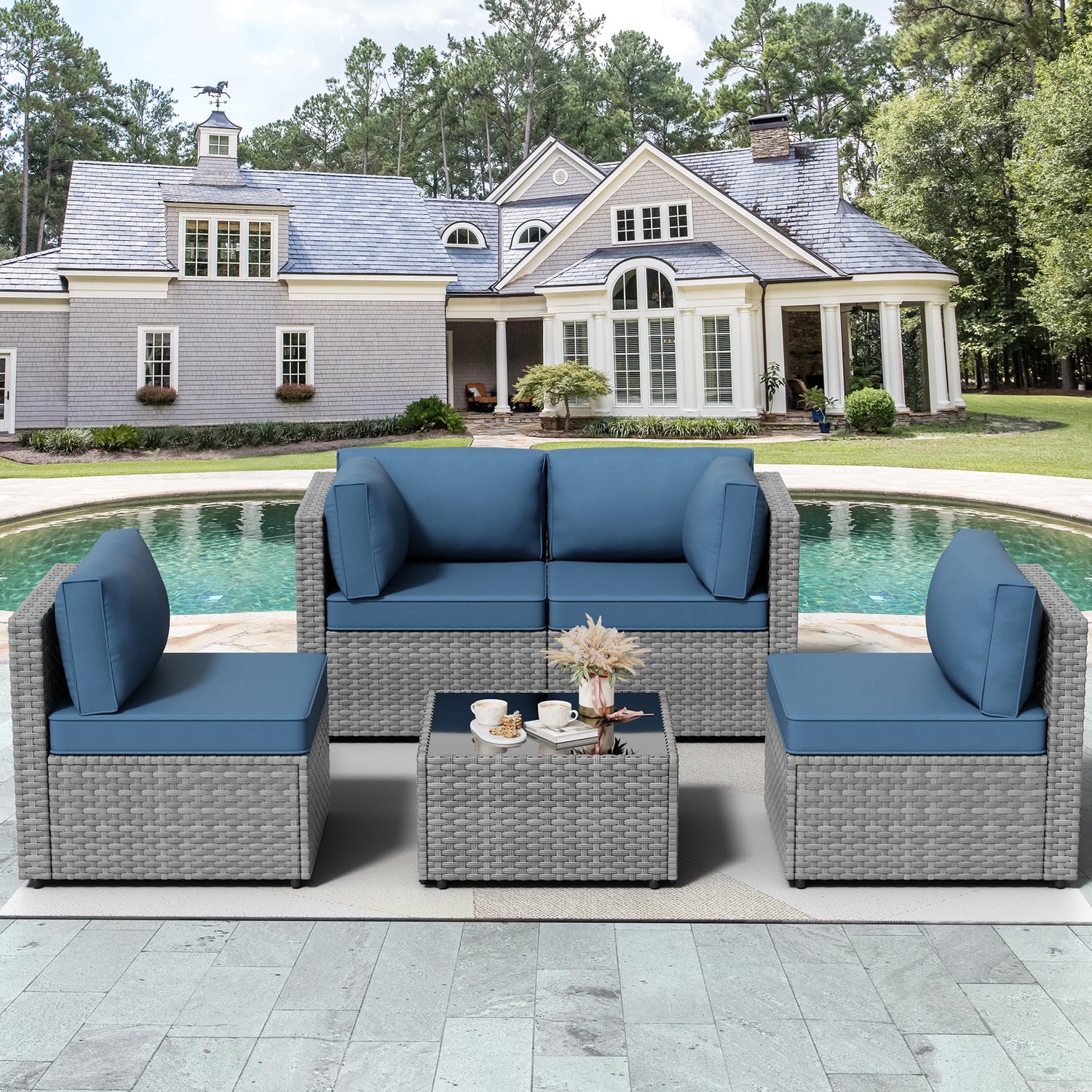 JAMFLY 5 Piece Outdoor Patio Furniture Set, PE Rattan Conversation Sofa Set with Thick Cushions & Glass Top Coffee Table, All-Weather Outside Furniture for Garden, Porch, Aegean Blue