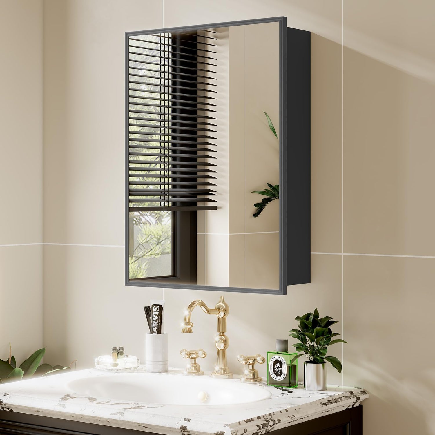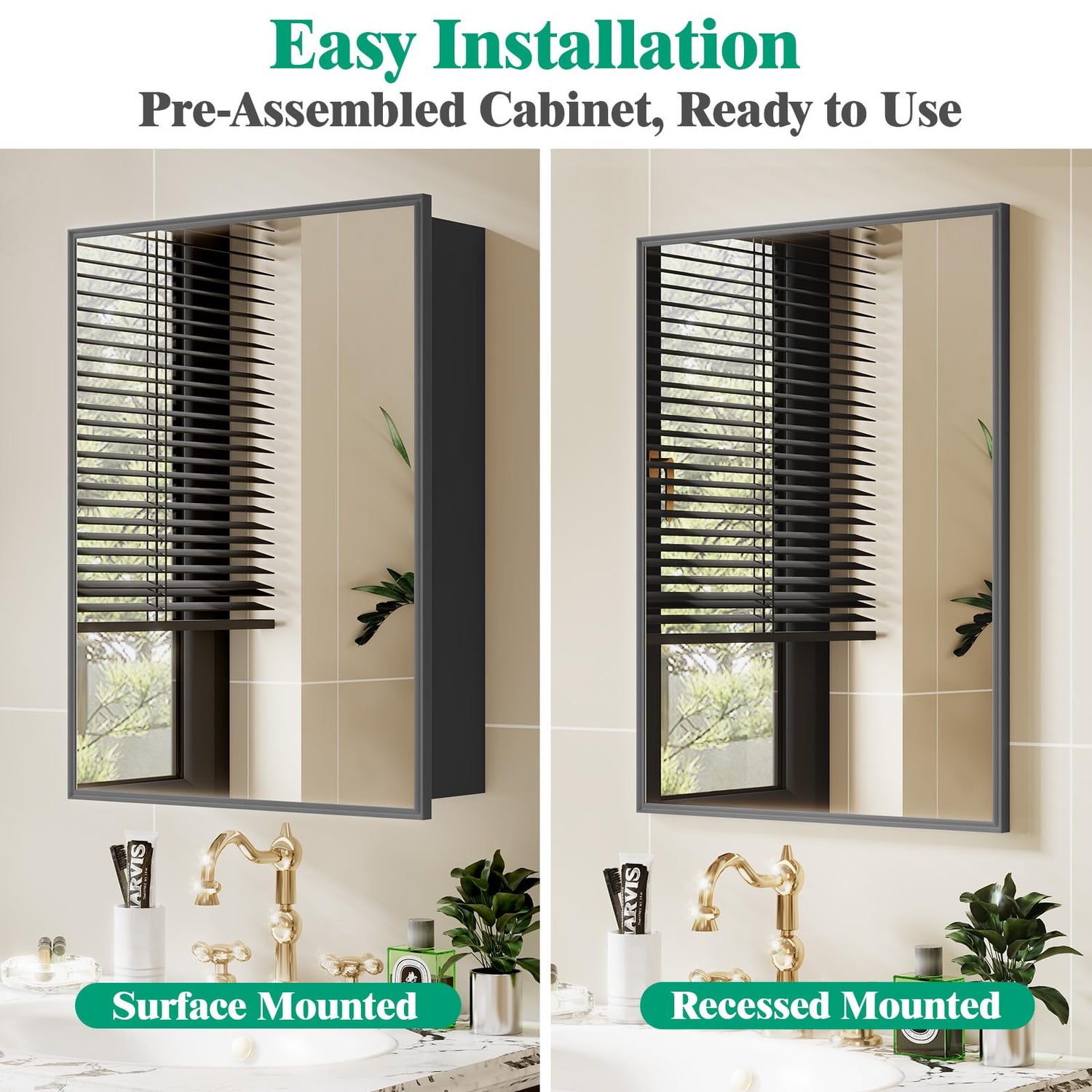 JBLCC Medicine Cabinet with Mirror (Full Assembled), 16''x22'' Aluminum Bathroom Mirror with Storage, Wall Mounted or Recessed Medicine Cabinet, Black