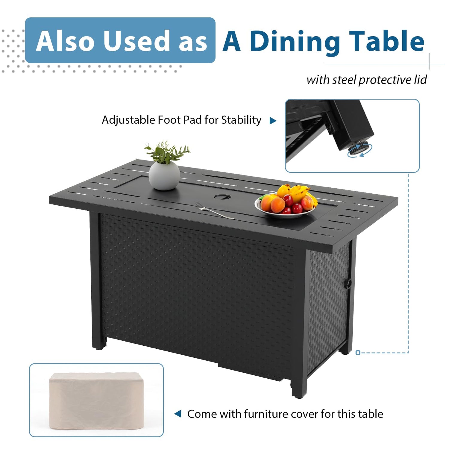 - 50,000 BTU Propane Fire Pit Table: Fueled by propane, this 45 inch fire pit table has a heat output of up to 50,000 BTUs and comes with a separate ignition and controls. Maximize the comfort and safety in the outdoors. This essential upgrade is perfect for those looking to extend their outdoor activities into the night. Plus, this fireplace table also comes with a stainless steel lid so you can use it as an dining table