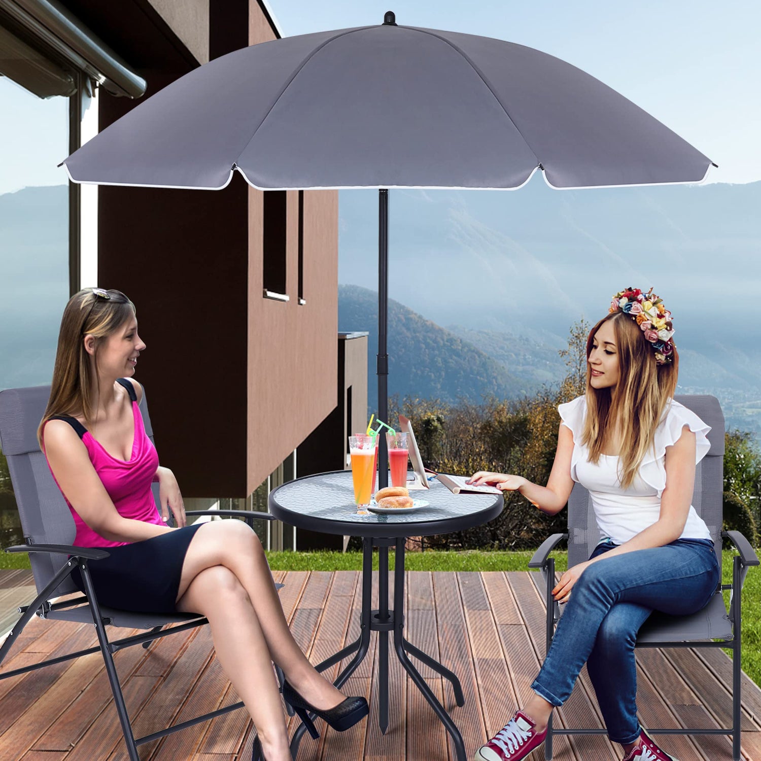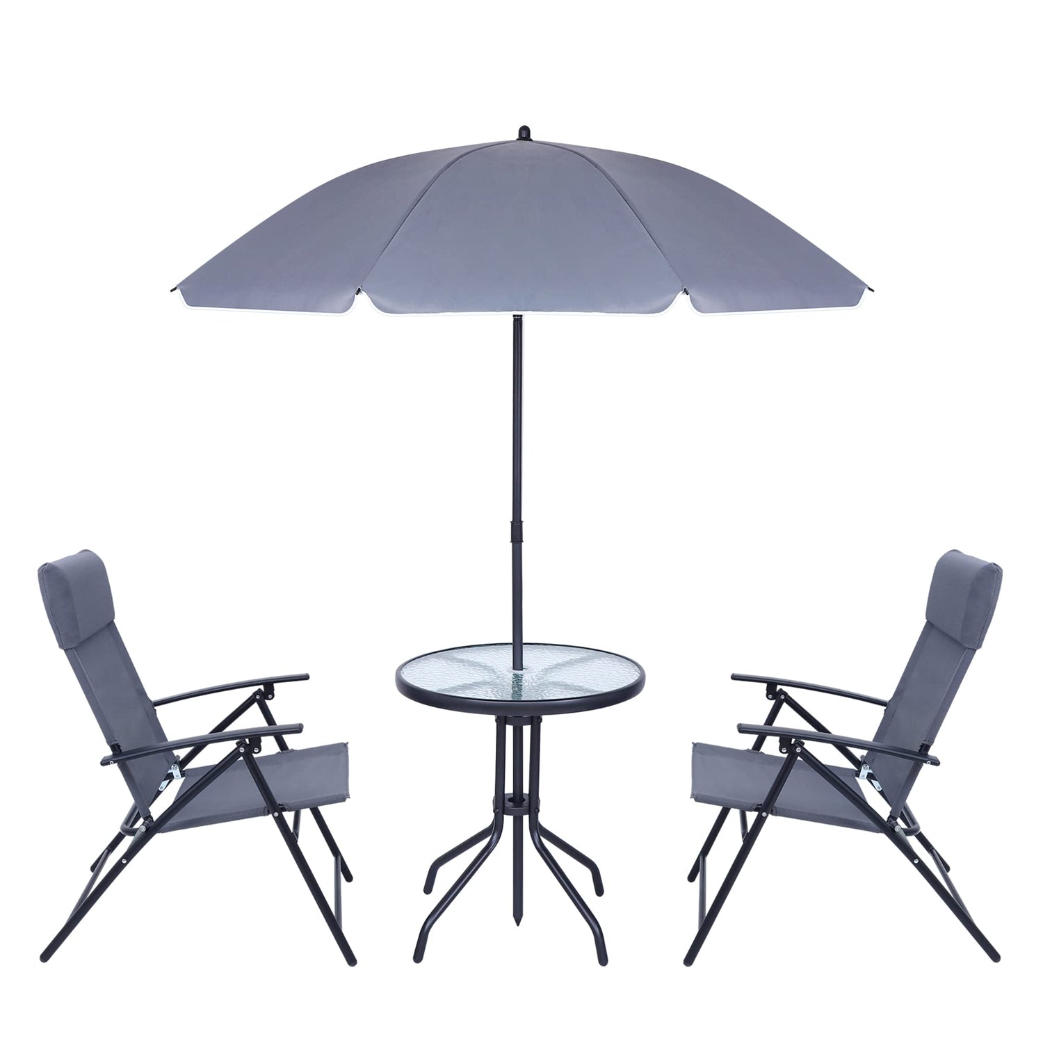 JOYTIO 4 Piece Patio Dining Set, Outdoor Garden Furniture Bistro Set with Tilted Removable Umbrella, 2 Folding Chairs, and Round Glass Table (Grey)