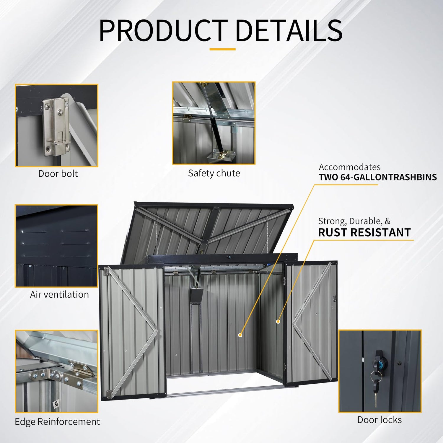 JT Metal Garbage Bin Shed, 65" x 54" x 60" Outdoor Storage Shed with Lockable Door, Waterproof Galvanized Trash Can for Garden Patio, Backyard, Lawn, Black