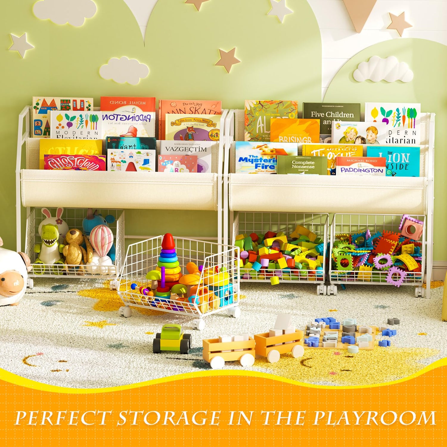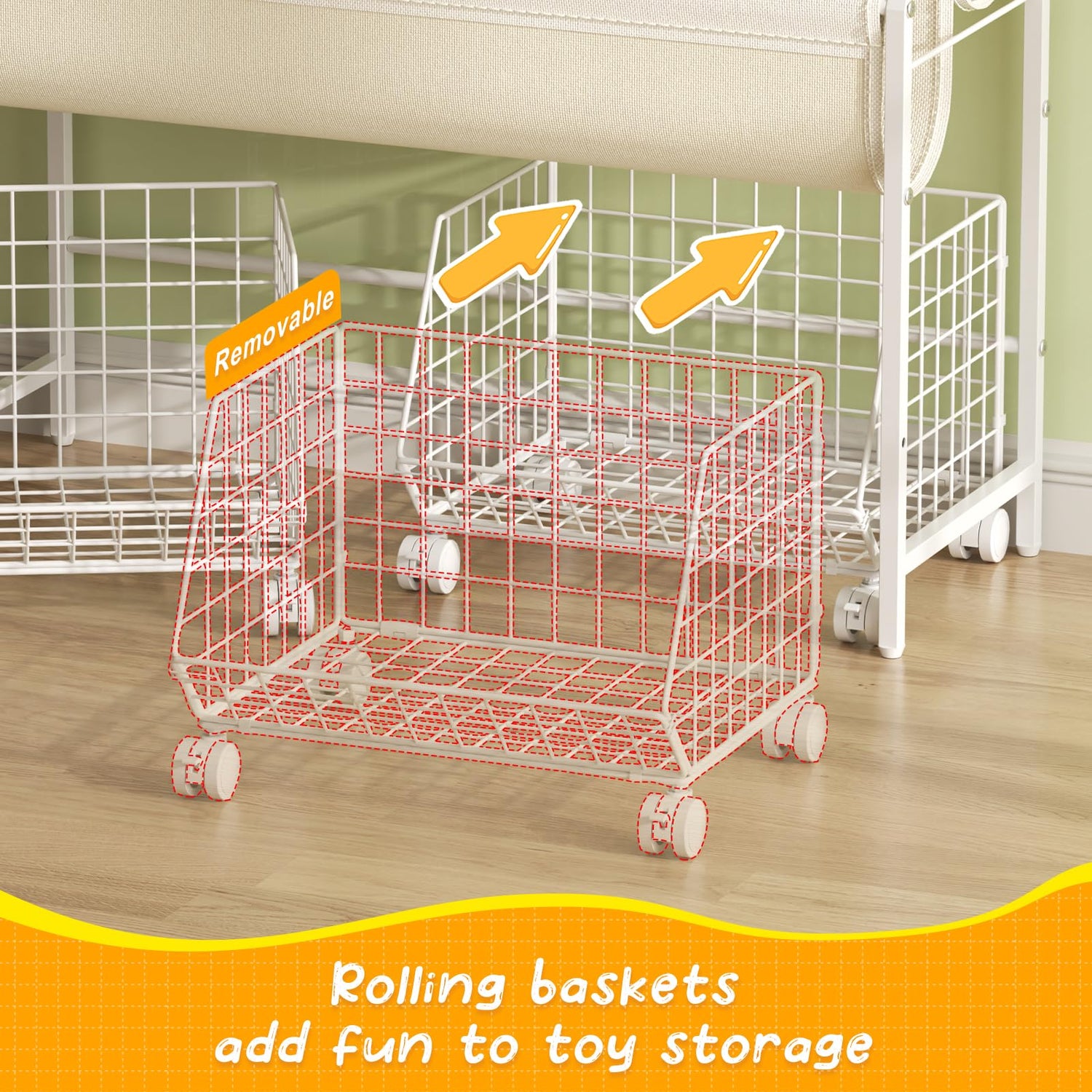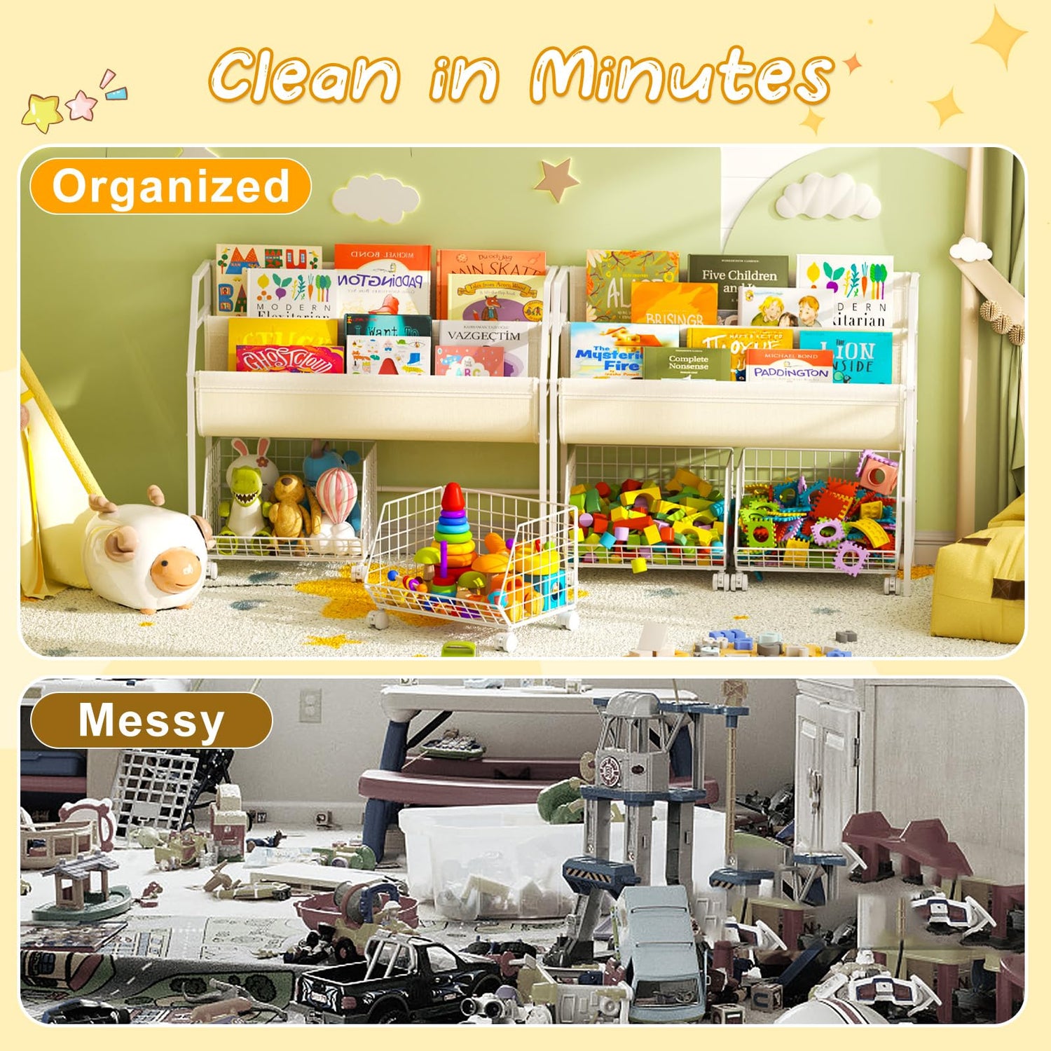 - Silent & Lockable Toy Baskets: Equipped with smooth-gliding, silent wheels and lockable wire baskets, this 2-in-1 organizer for books and toys ensures quiet cleanup that won’t disturb nap time. Lock the wheels in place to keep baskets secure—perfect for active toddlers and peaceful homes.