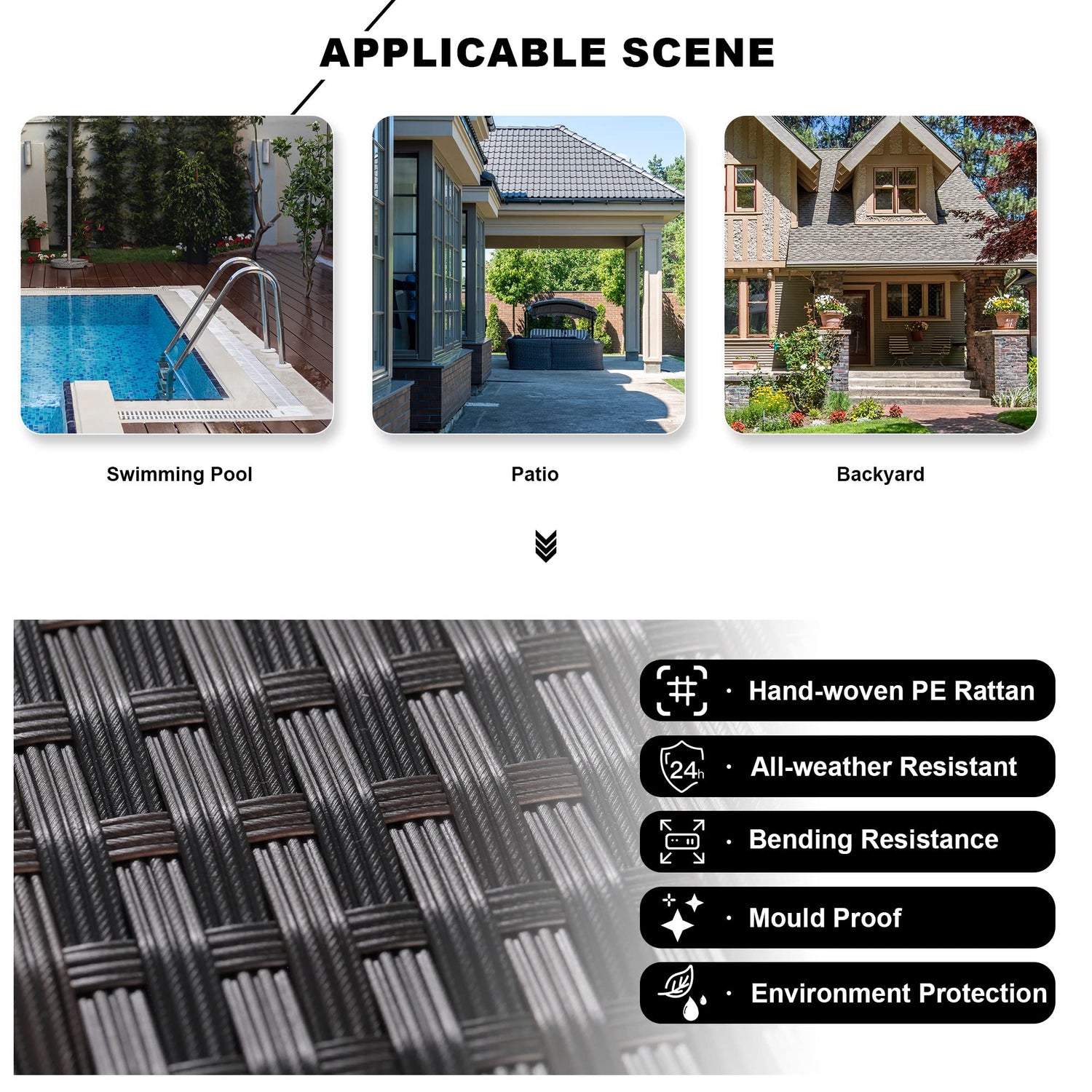 - Sturdy Frame and PE Rattan: The overall structure of the outdoor patio furniture set consists of two main parts. One is the sturdy rust-proof steel frame, which is made of heavy-duty metal coated with a coating that greatly enhances stability. The second part is the PE rattan, which is synthetic wicker. This type of wicker is stronger and more durable than other wicker, ensuring that the sofa set can be used for a long time.