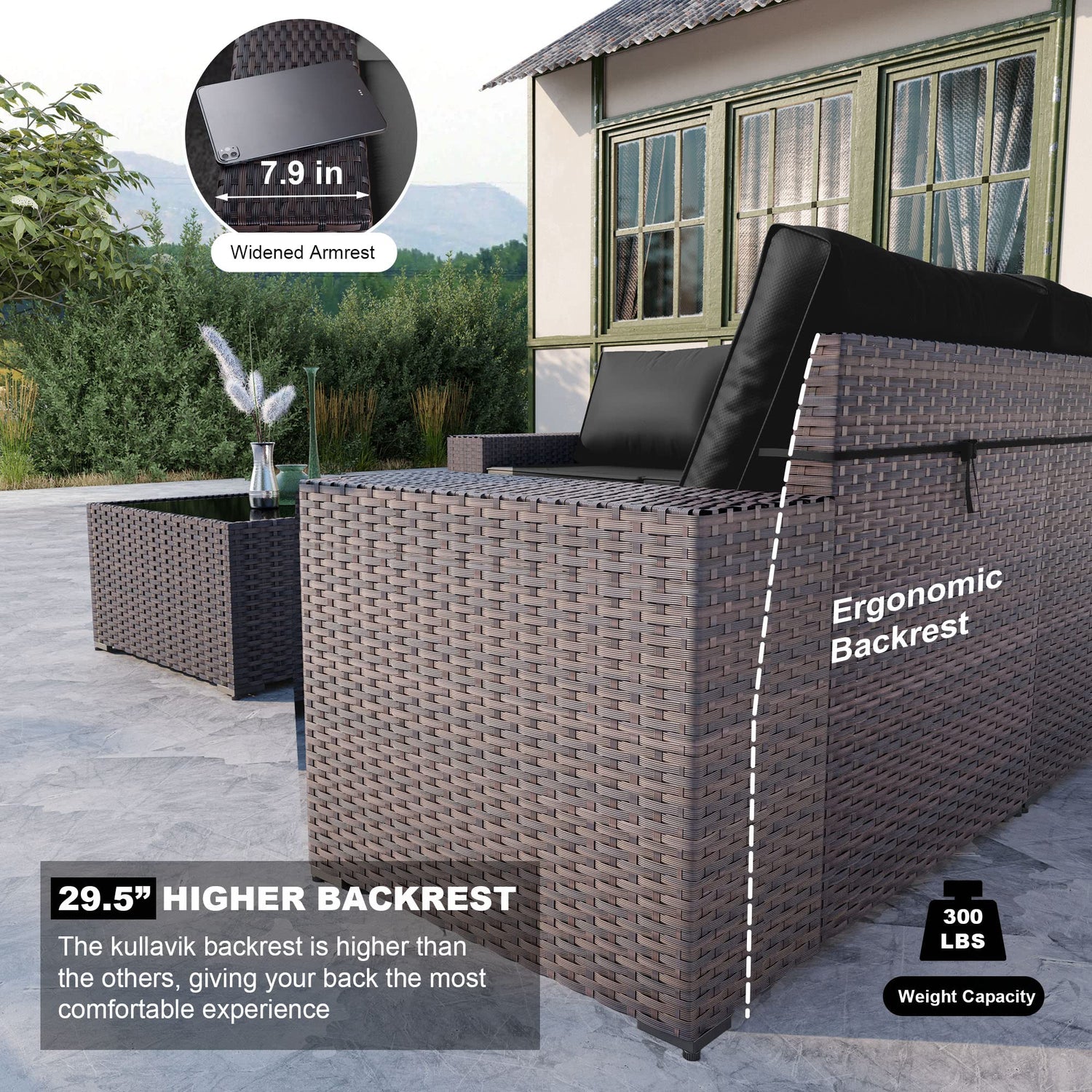 Kullavik Outdoor Patio Furniture Set 6 Pieces Sectional Rattan Sofa Set Brown PE Rattan Wicker Patio Conversation Set with 5 Seat Cushions and 1 Tempered Glass Table,Black