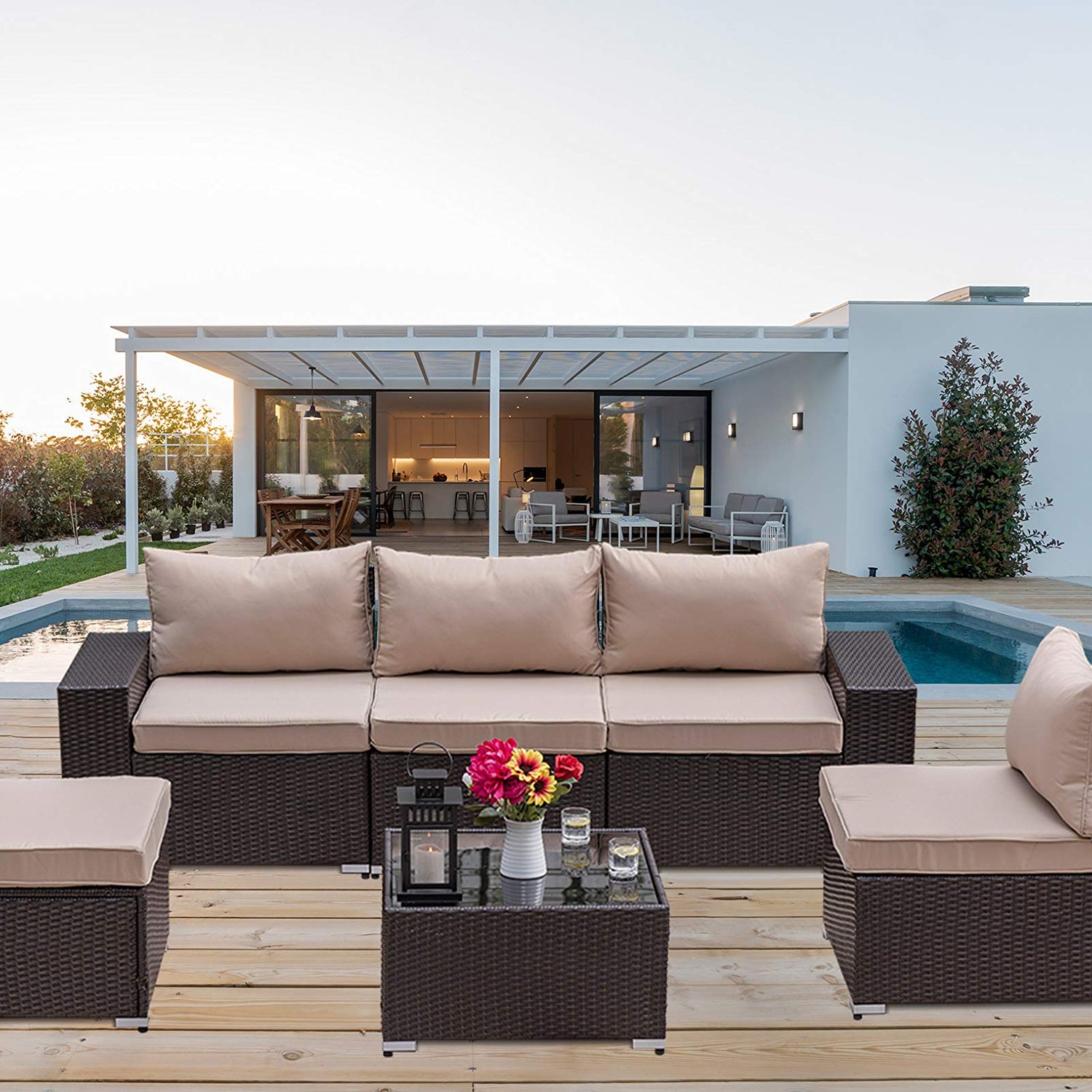 Kullavik Outdoor Patio Furniture Set 6 Pieces Sectional Rattan Sofa Set Brown PE Rattan Wicker Patio Conversation Set with 5 Seat Cushions and 1 Tempered Glass Table,Sand