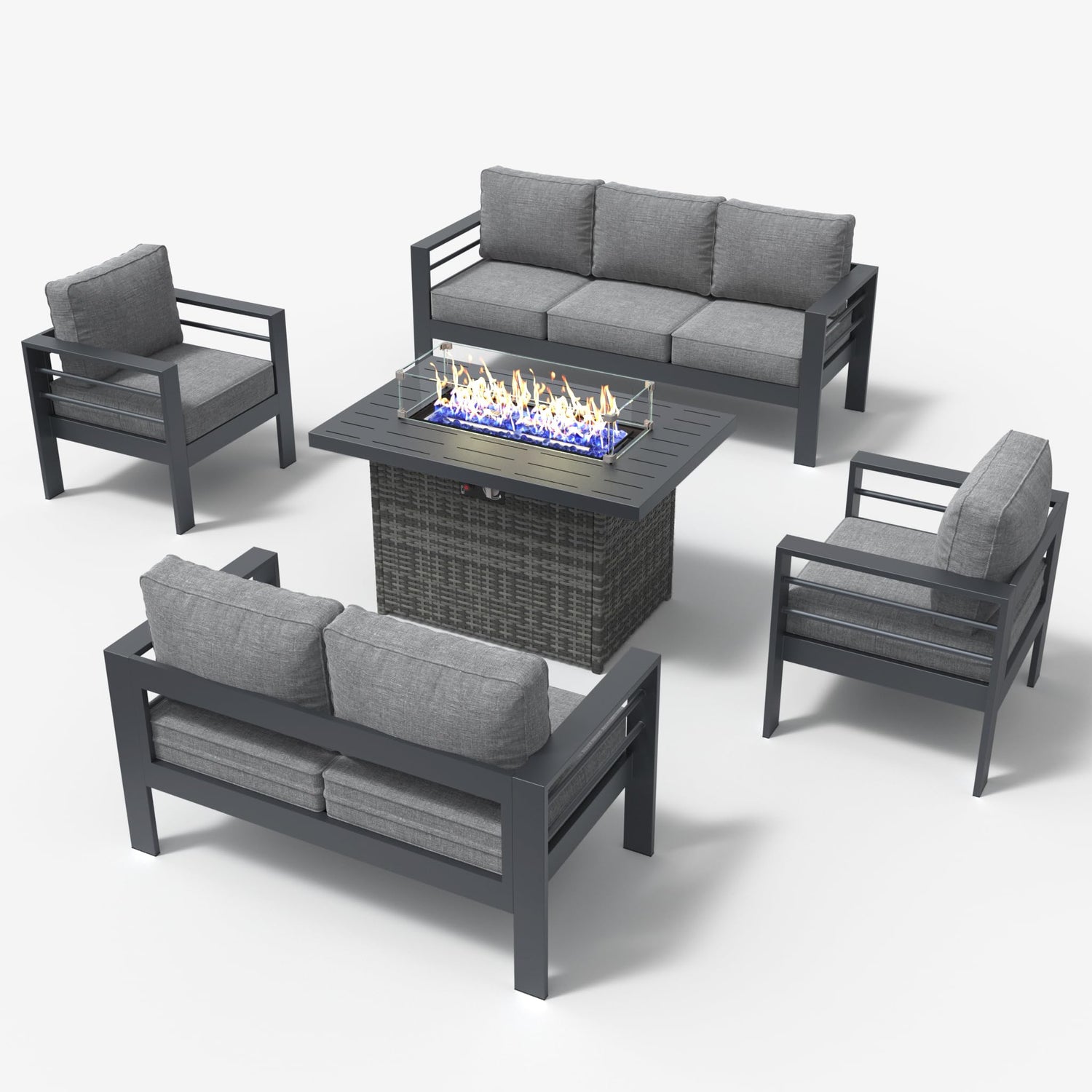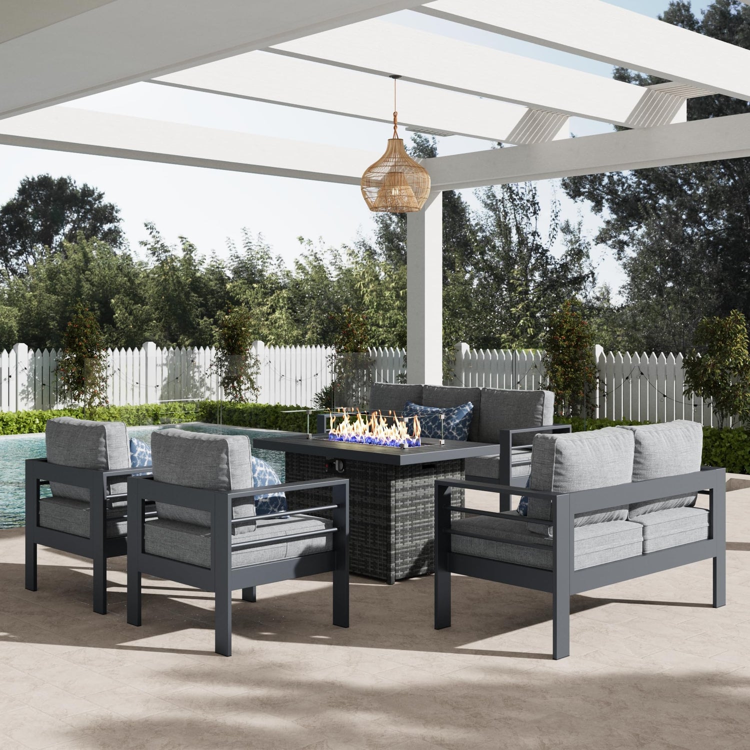 LayinSun Aluminum Furniture Set with Fire Pit Table, 5 Pieces Patio Sectional Conversation Chat Sofa Modern Seating Set
