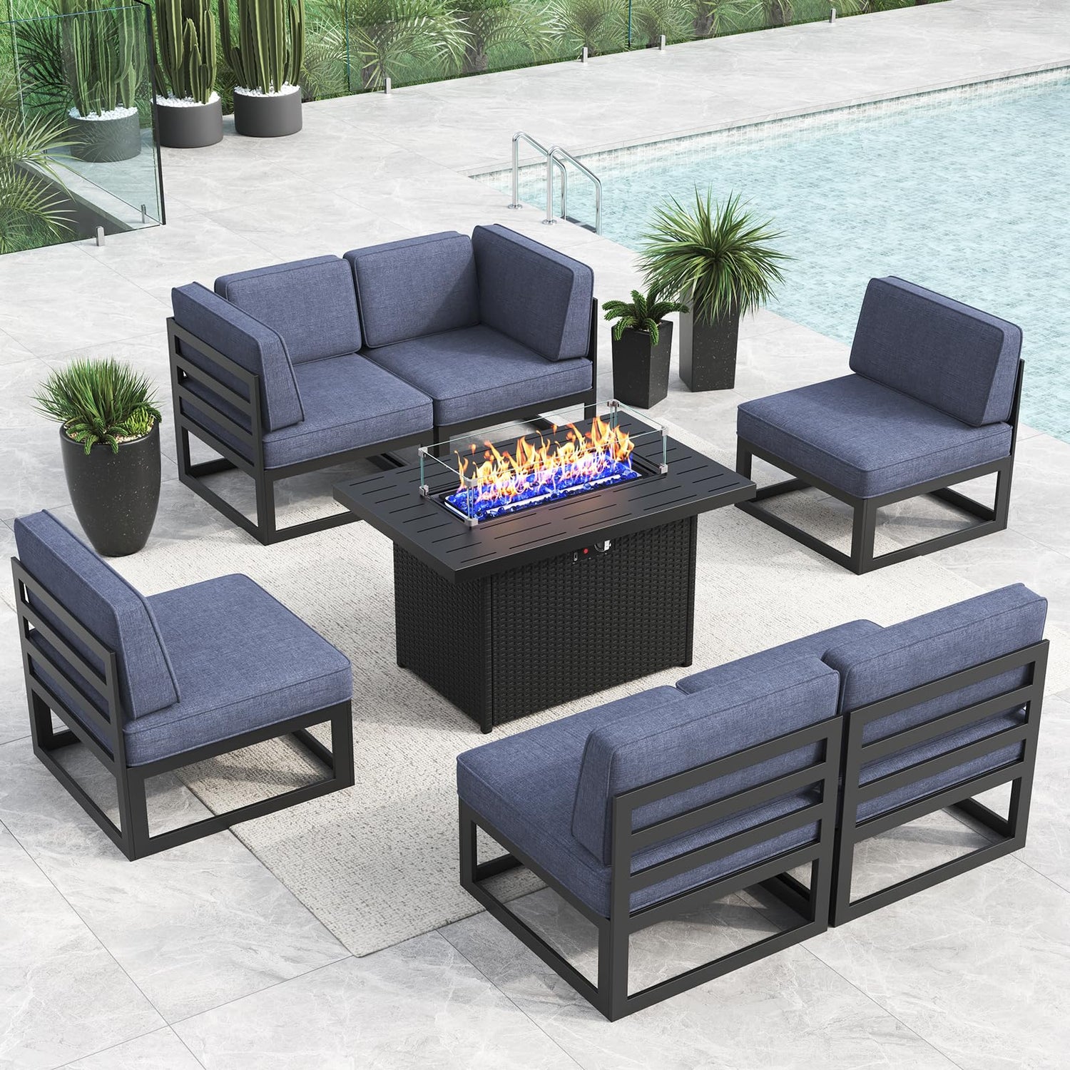 LayinSun Large Aluminum Patio Furniture Set with Fire Pit Table, 7 Pieces Modern Outdoor Conversation Set Sectional Metal Sofa Set with Olefin Cushion