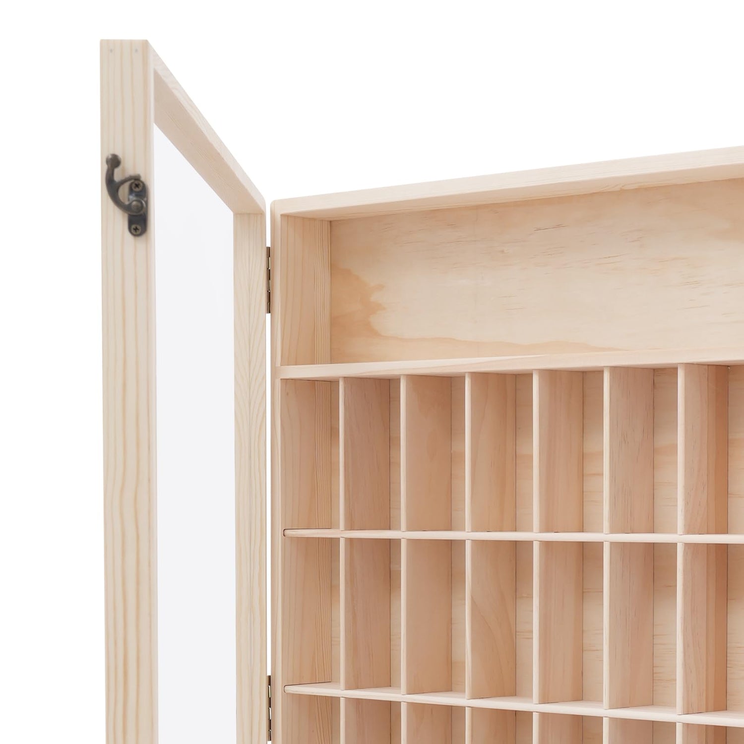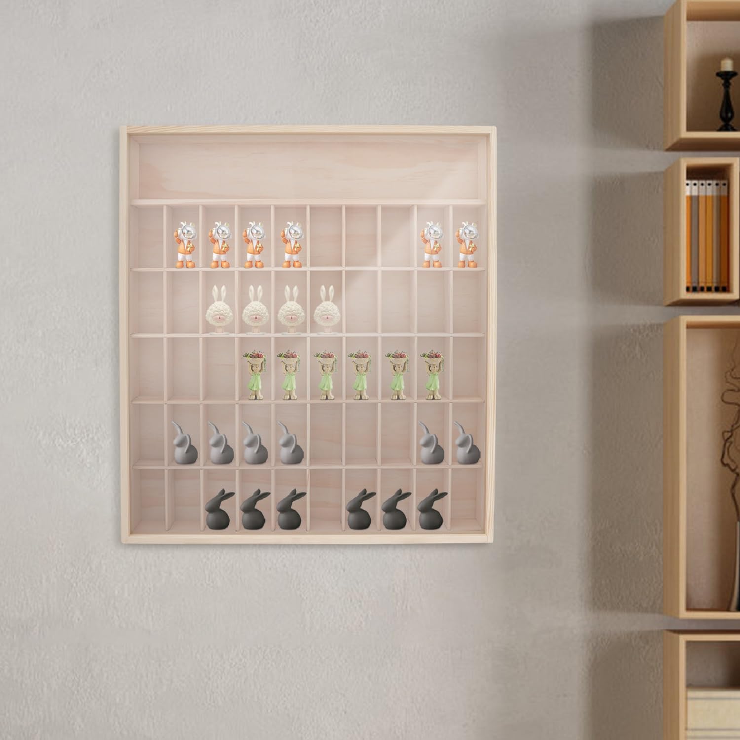 - Large Capacity: This wall mount wooden display case has a total of 6 tiers, including 50 small compartments and an uncompartmented top tier, which is enough to accommodate your many action figures