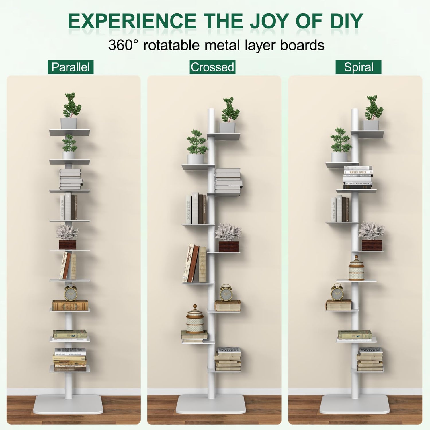 - DIY Design: The metal layer boards of the spine book tower are rotatable, so you can change their orientation as needed to make better use of the space. You can also adjust according to your preferences, creating a unique bookshelf that breaks up the monotony and gives your room more interest and personality