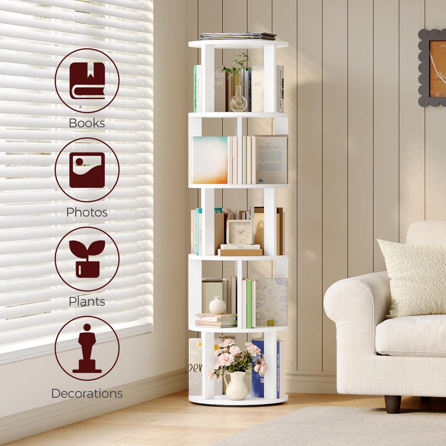 MAHANCRIS 5-Tier Rotating Bookshelf, 360° Spinning Bookshelf Tower, Floor Standing Round Revolving Bookcase, Display Rack for Books, CDs, for Living Room, Study, Bedroom, White BKWT6501
