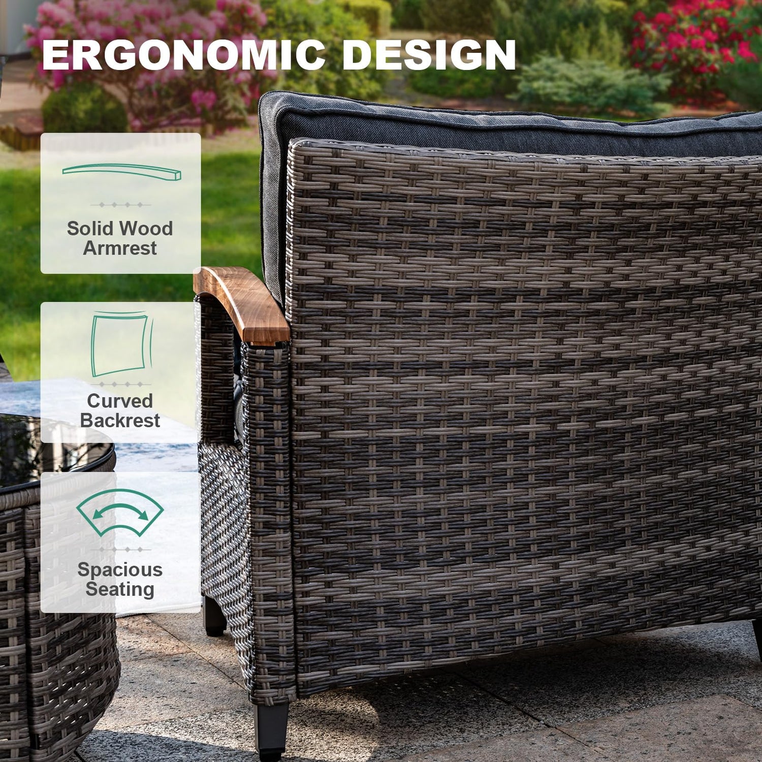 - Durable & All-Weather: Crafted from powder-coated metal frames and premium PE rattan, this outdoor furniture set is built to last. Natural wood armrests and legs add strength, ensuring years of outdoor enjoyment, no matter the weather