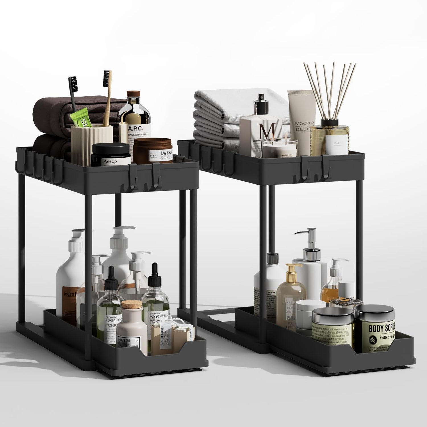 - VERSATILE FOR WHOLE-HOME ORGANIZATION: Double your organizing power and value! This set includes two complete pull-out organizers, perfect for creating a streamlined system throughout your home. Use one for cleaning supplies & trash bags, and the other for toiletries & makeup. They're also ideal for pantries, laundry rooms, offices, or even organizing pet supplies. A must-have for new homeowners and apartment dwellers looking to maximize every inch of space.