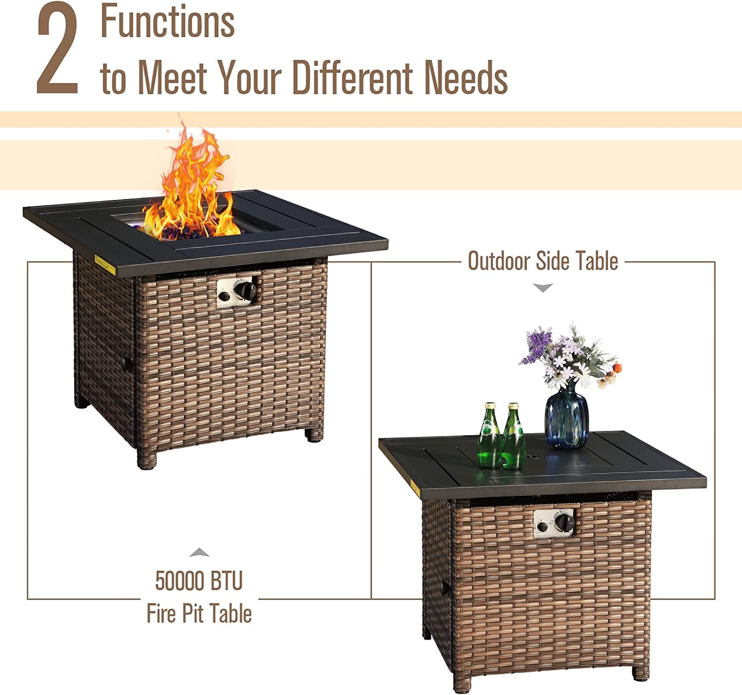 - 32" Extra Lage Fire Pit Table: This outdoor 50,000 BTU square propane gas fire pit table is the perfect addition to your outdoor furniture set. It beautifully merges the classic style of a coffee table with the warmth of a fire pit. Enjoy cozy evenings and get-togethers as it creates a welcoming atmosphere for your outdoor space