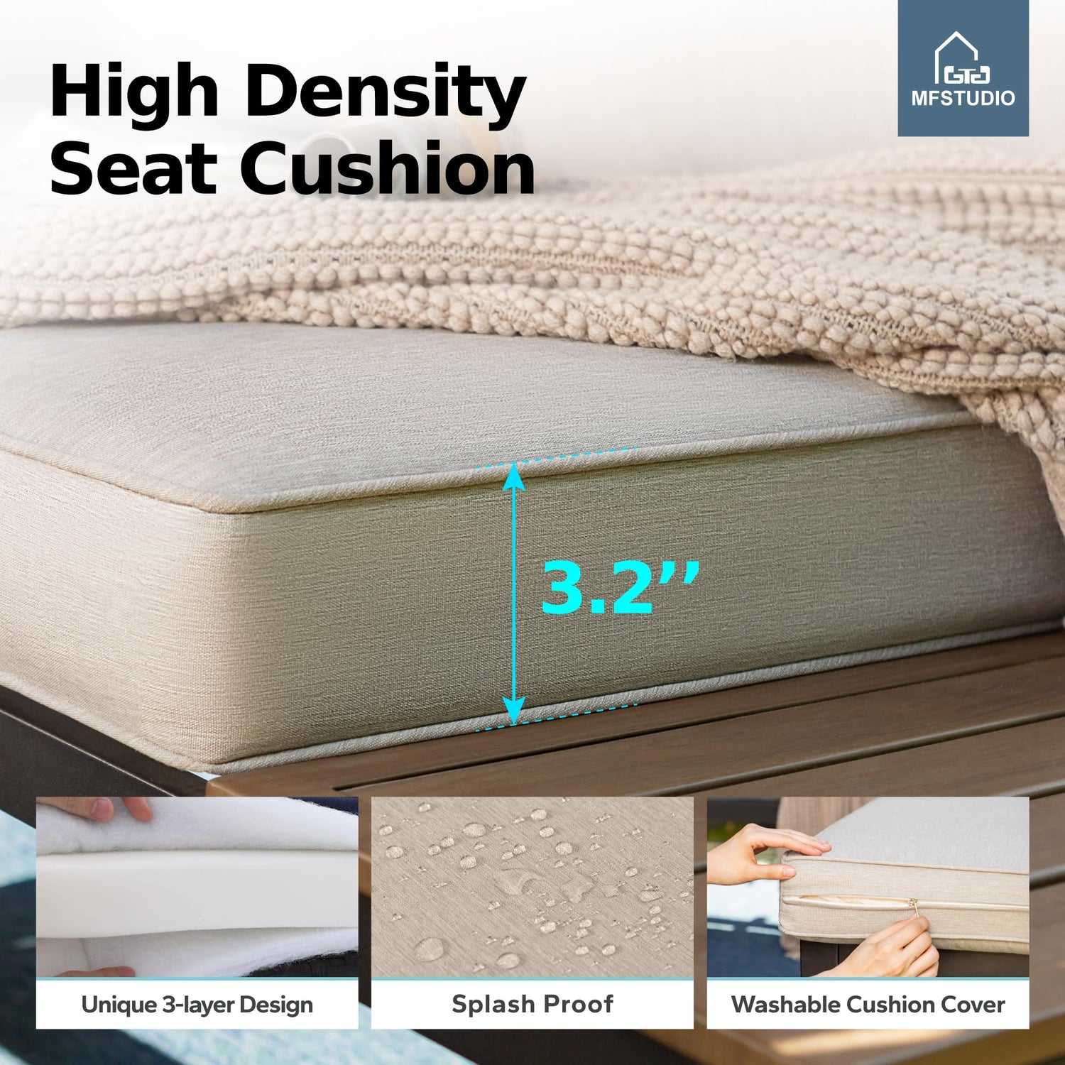 • Comfort Upgrade: Each cushion is thoughtfully designed with 3.2" high-density sponge for superior comfort and quick rebound. The cushions are securely attached to the frame but can also be easily removed for cleaning or when not in use. Upholstered in water-resistant Olefin fabric, these thick cushions are ergonomically designed to provide optimal comfort