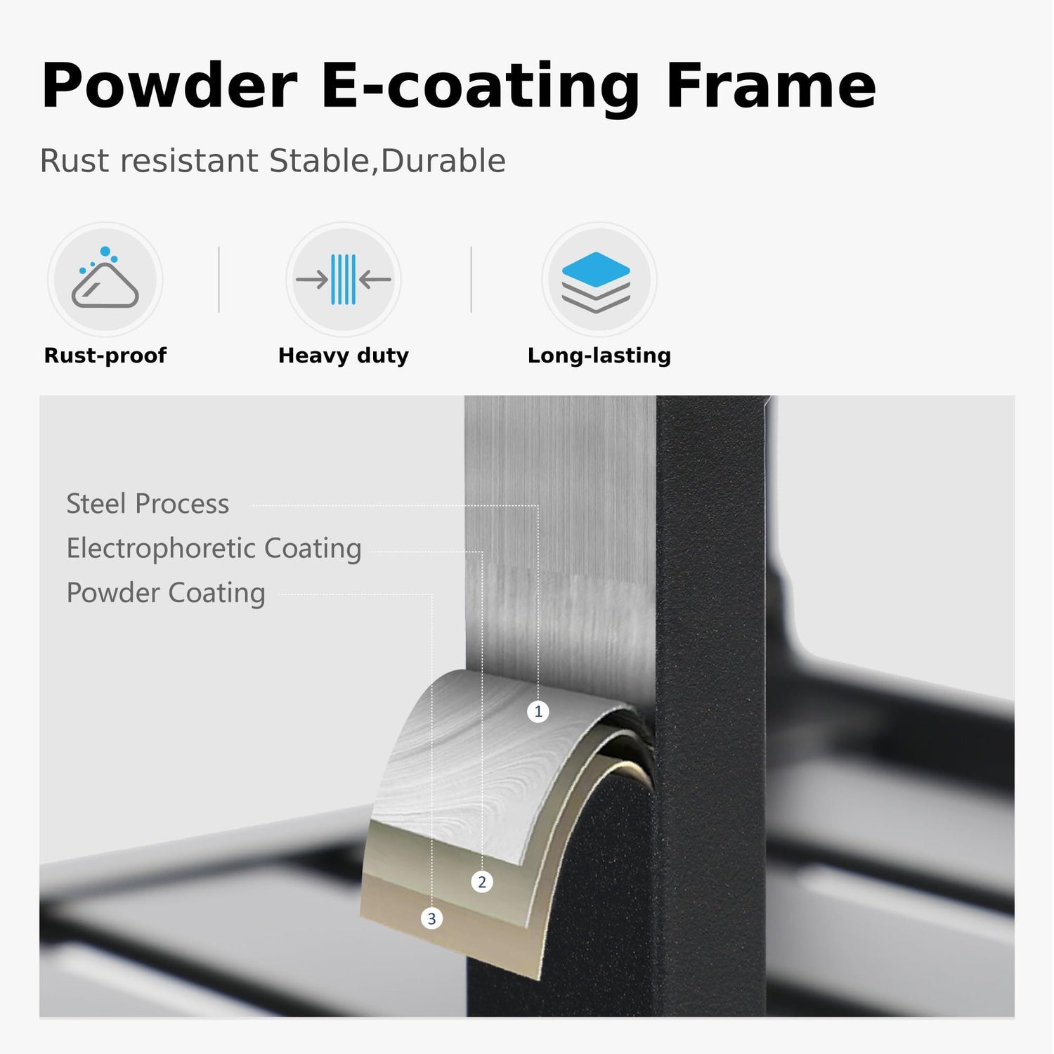 • STURDY & DURABLE: Heavy-Duty Elegant Black Steel Frame, with E-coating for Rust and Corrosion Resistant. Metal steel frame longevity with e-coating needs no special maintenance,rust and weather resistant, easy to clean, easy to assemble;