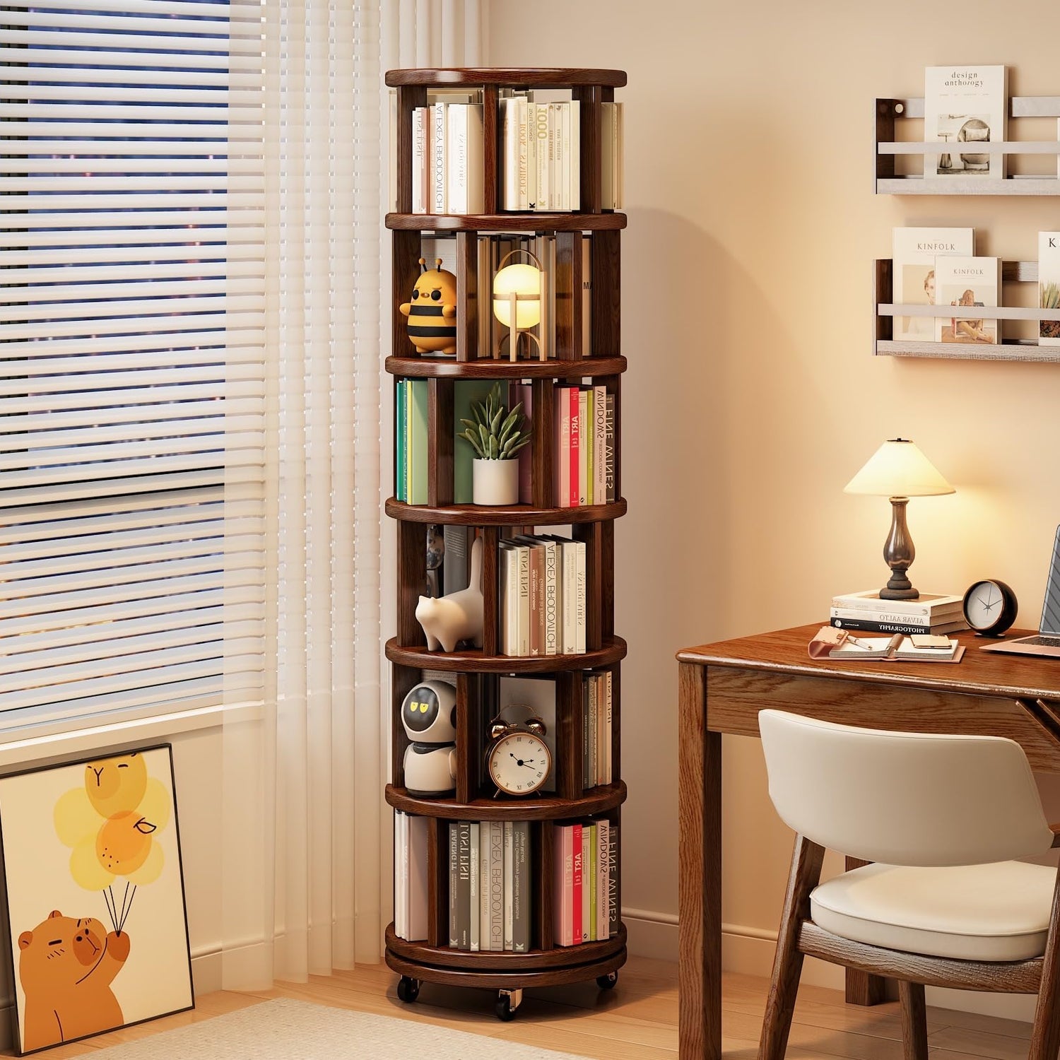MKSDJIW 6 Tier Rotating Bookshelf, Solid Wood Spinning Bookcase Tower, 360° Spinning Book Shelf Tower for Kids, Narrow Rolling Bookshelves for Small Space, Bedroom, Office