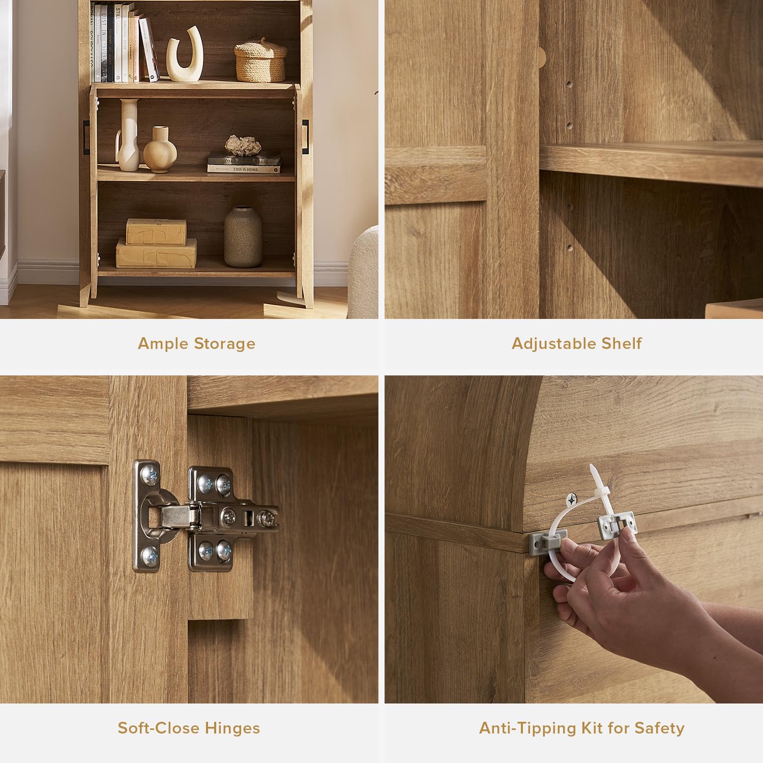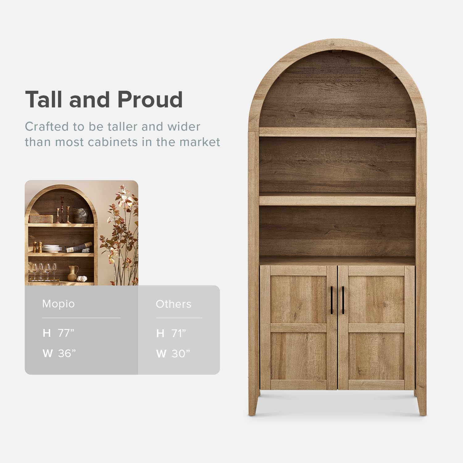 mopio Lauren 77.4" Tall Arched Cabinet, 5-Tier Arched Bookcase with Doors and Adjustable Shelves, Arch Bookshelf with Storage, Wooden Storage Cabinet for Living Room and Kitchen Pantry (Oak)