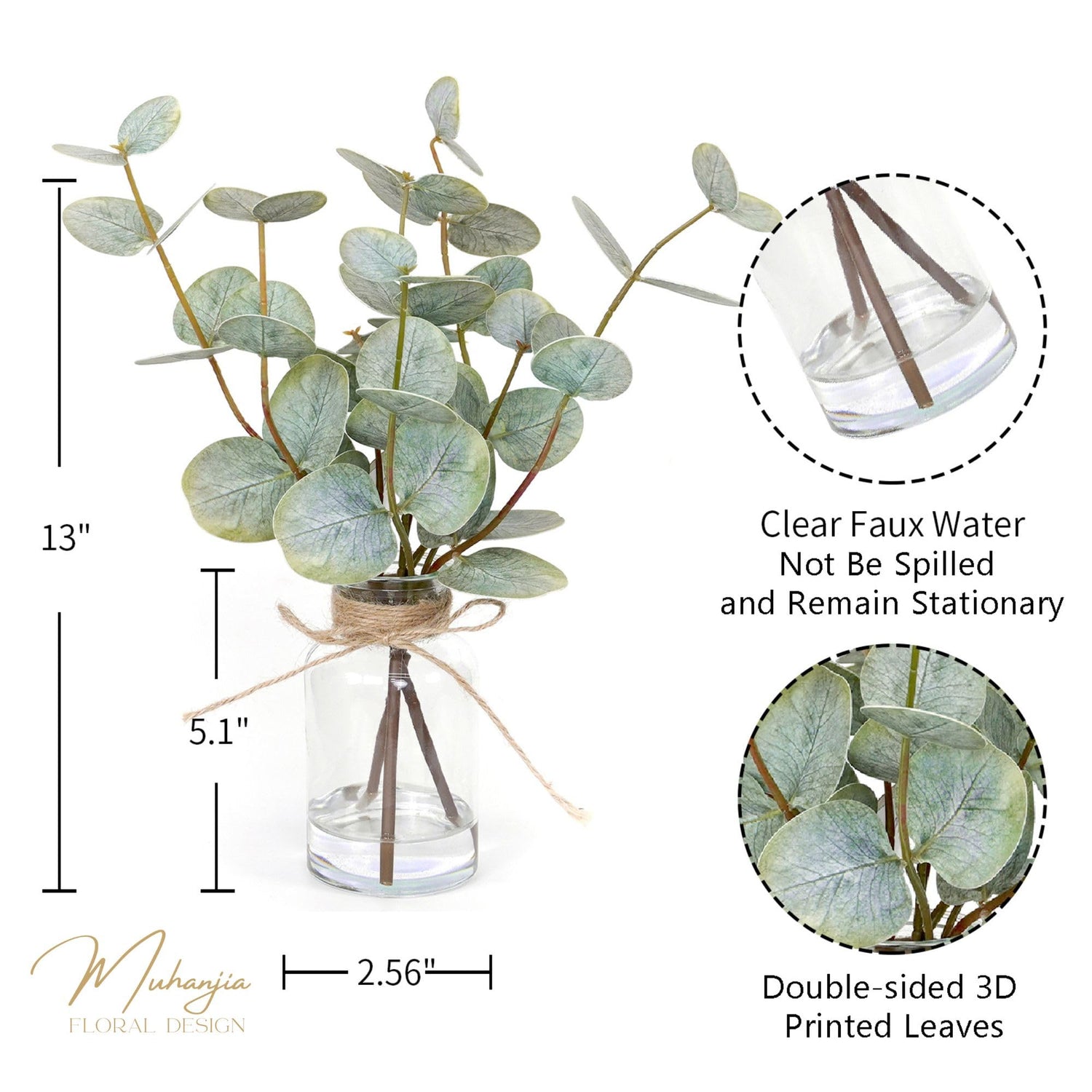 - đăPerfect SizeăOverallďź13 inches height, Approx 11.8 inches width. Decorative glass vase is 2.6Wx5.1H inches. There are 3Pcs fake plant with double-sided eucalyptus leaves in vase,and each 1Pc eucalyptus plant has three branches, totaling 17 leaves.