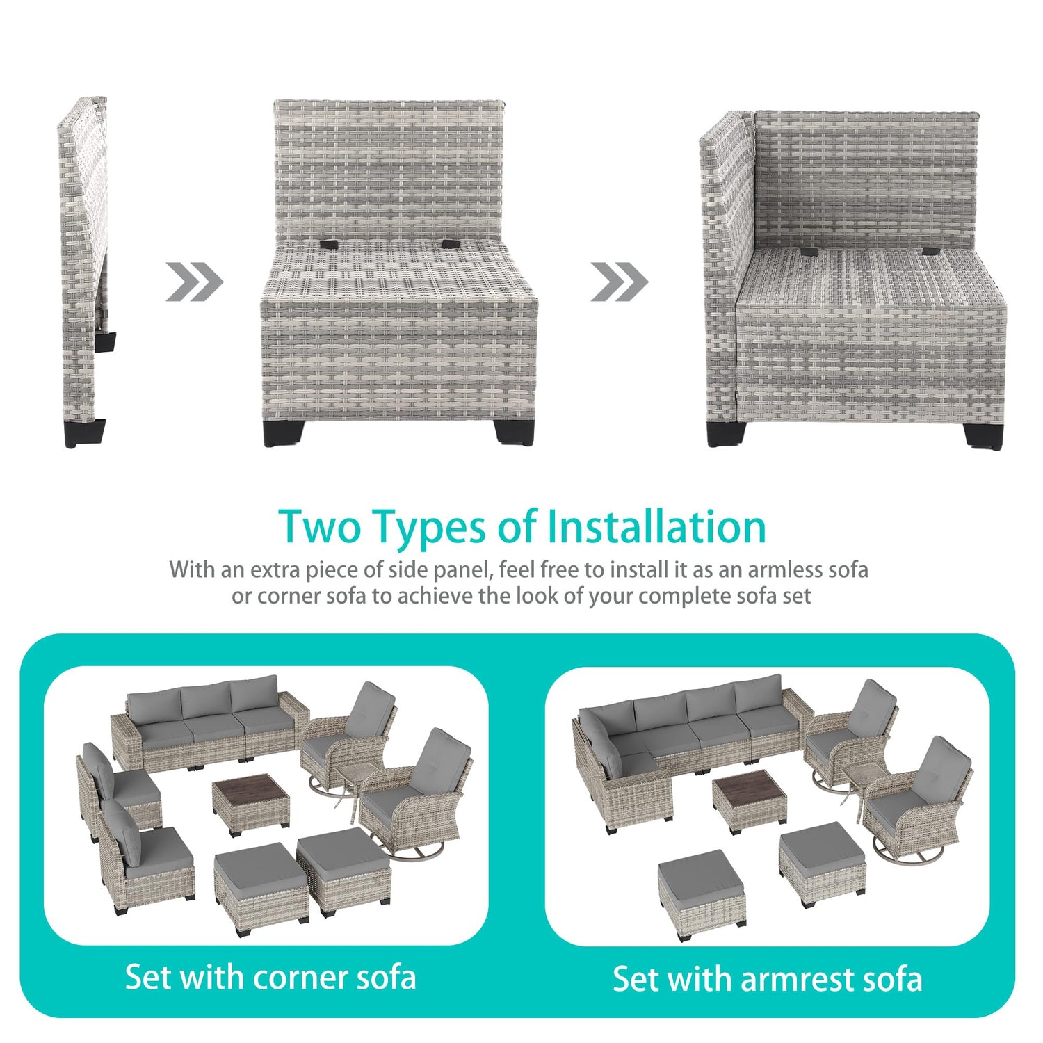 • PATIO FURNITURE SET: Transform your outdoor space with the Muphyers 11-piece wicker patio furniture set! The set includes 1 left armrest of the sofa, 1 right armrests of the sofa, 2 armless sofas, 1 multifunctional sofa (which can be assembled into an armless sofa or corner sofa), 2 ottomans, 2 swivel chairs 1 side table and 1 tempered glass coffee table. All necessary tools and easy-to-follow instructions for hassle-free assembly