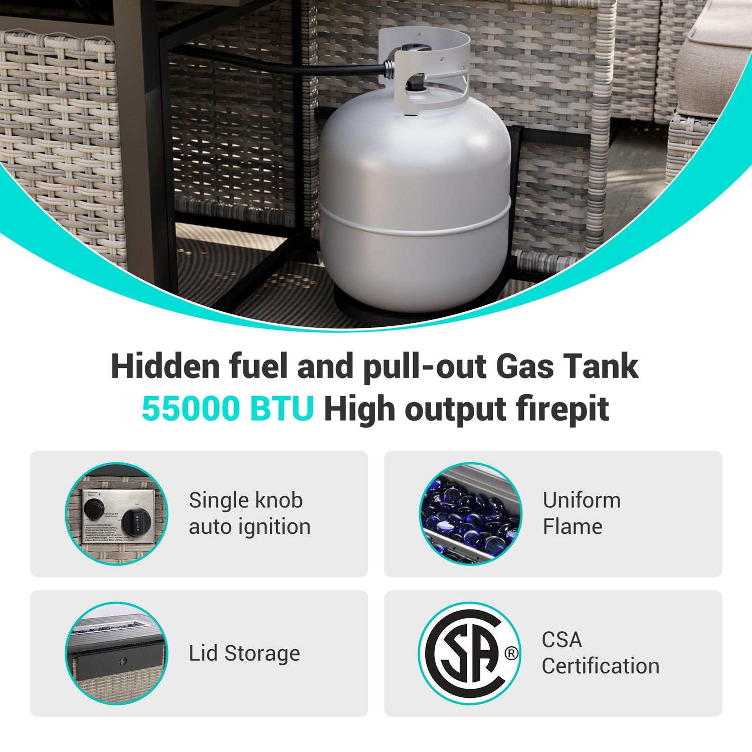 - Easy Assembly & Clean: This rattan set is designed for hassle-free setup and upkeep. The modular pieces assemble quickly, and the rattan material is easy to clean—just wipe with a damp cloth. The fire pit table is compatible with standard propane tanks (not included) for convenient use