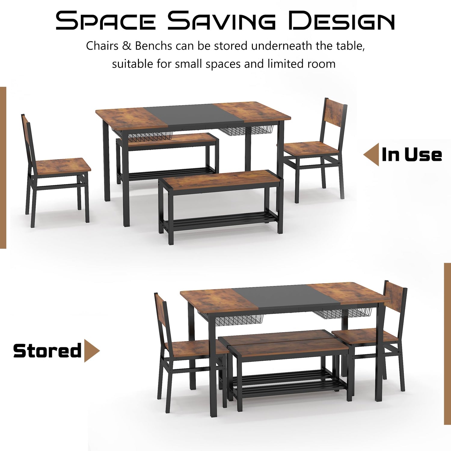 NAIYUFA Dining Table Set for 4-6 People,Industrial Dining Table with 2 Benches and 2 Chairs,Kitchen Table Set with Storage Rack for Dining Room,Saving Space,Rustic Brown