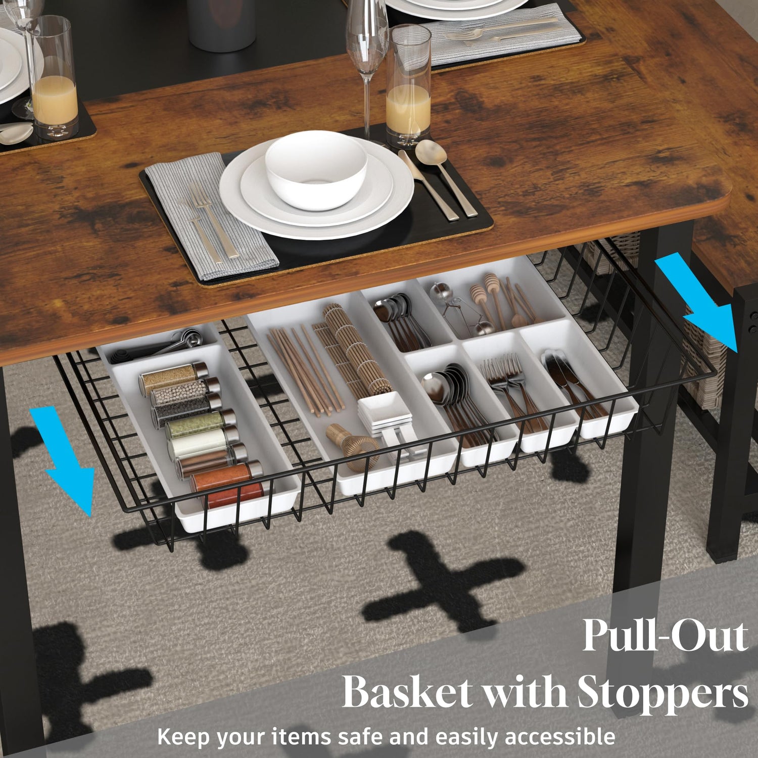 - 【Table and chair set】 Kitchen dining table set includes 1 table(55.12" ×31.45" ×29.92" ), 2 benches (33.86" ×11.81" × 16.22in"), 2 chairs(15" ×15.75" ×16.54" ), 2 basket drawers(15.75" ×22.83" ×3.15" ), The spacious desktop and 4 chairs can easily accommodate 4-6 people for dining, providing plenty of space for family gatherings.