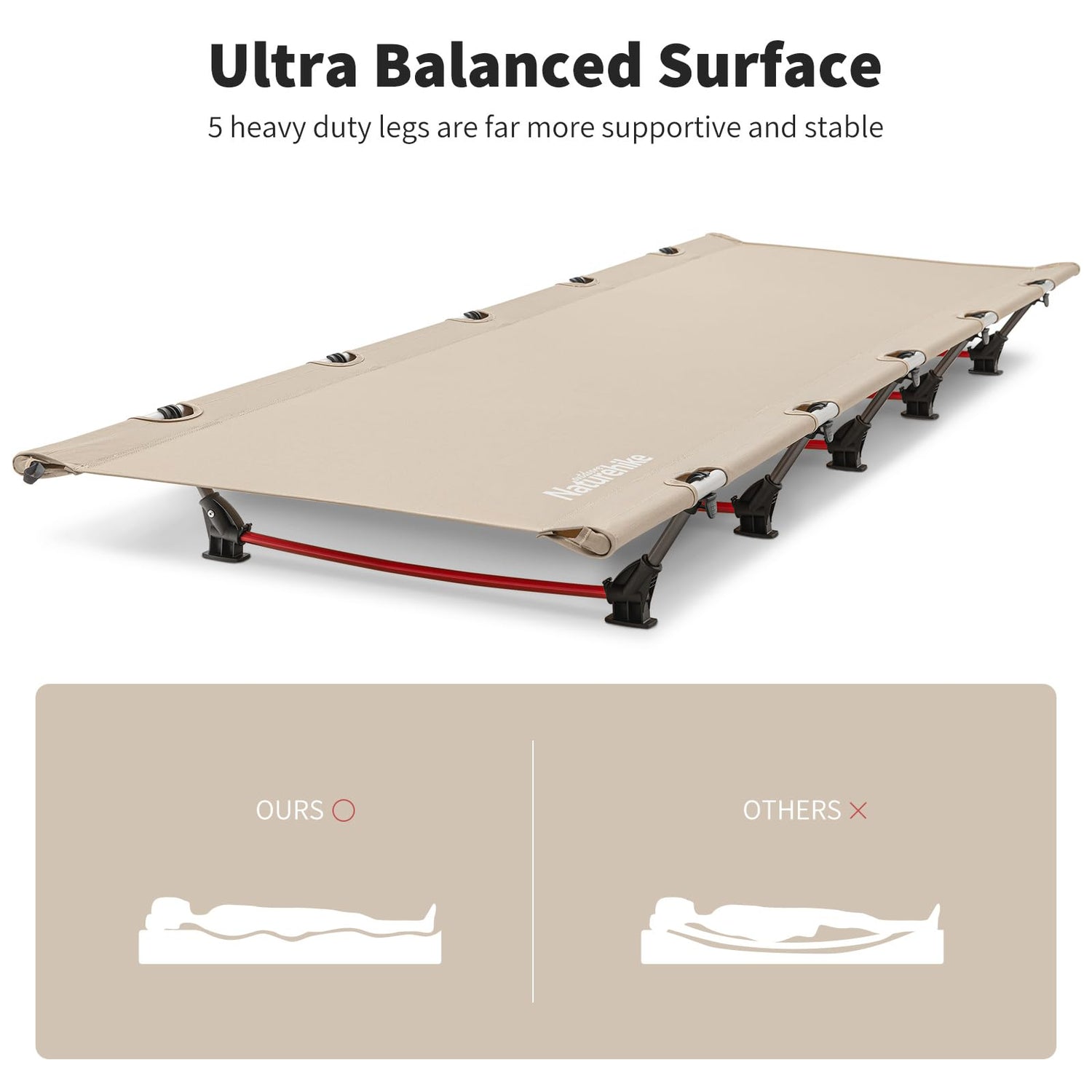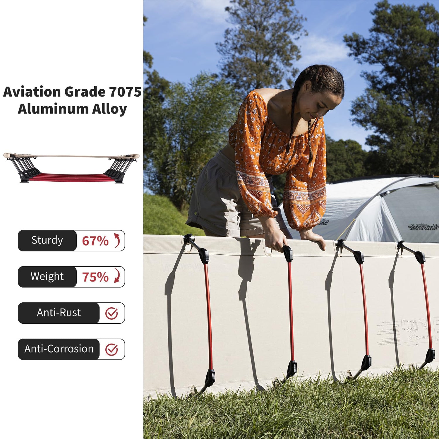 - 【STURDY & RELIABLE】The Camp Cot is made of aircraft-grade 7075 aluminum alloy, which is 67% stronger than ordinary aluminum alloy. The tent cot has a total of 5 support legs and can provide more support than 3 legs. It easily supports 330 lbs while keeping the bed flat and preventing it from sinking