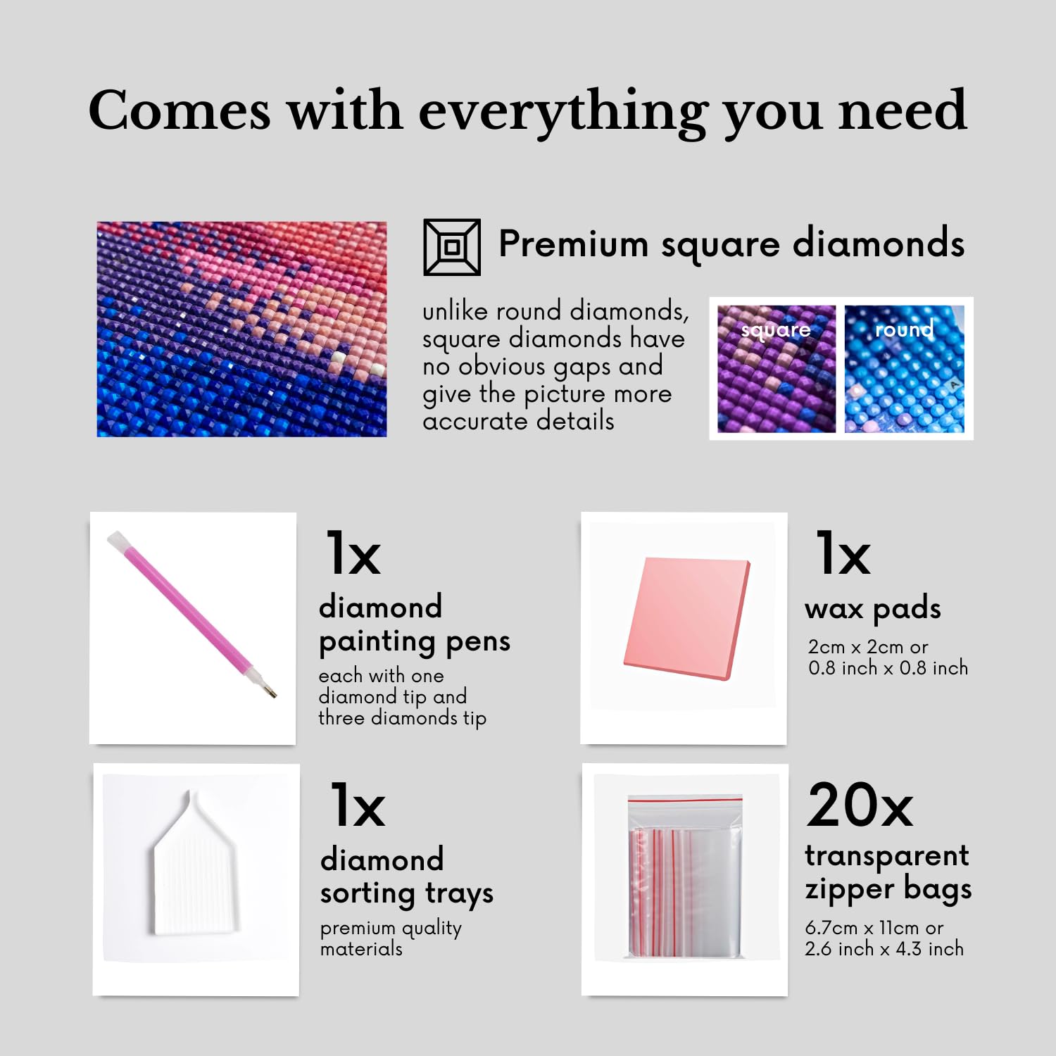 - What’s Included: One 30*40cm full drill diamond painting (square diamonds). One diamond painting tools kit which has 1 diamond painting pen, 1 tray, 1 wax, and 20 zipper bags.